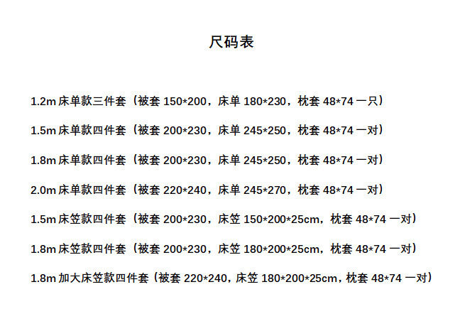 | Dimensions | 1.2m bed sheet three-piece set (quilt cover 150*200, bed sheet 180*230),1.5m bed sheet four-piece set (quilt cover 200*230, bed sheet 245*250),1.8m bed sheet four-piece set (quilt cover 200*230, bed sheet 245*250),2.0mbed sheets four-piece set (quilt cover 220*240, bed sheets 245*270),1.5m fitted sheet set of four (quilt cover 200*230, fitted sheet 150*200*25cm),1.8m fitted sheet set of four (quilt cover 200*230, fitted sheet 180*200*25cm),1.8m extra large fitted sheet set of four (quilt cover 220*240, fitted sheet 180*200*25cm) |