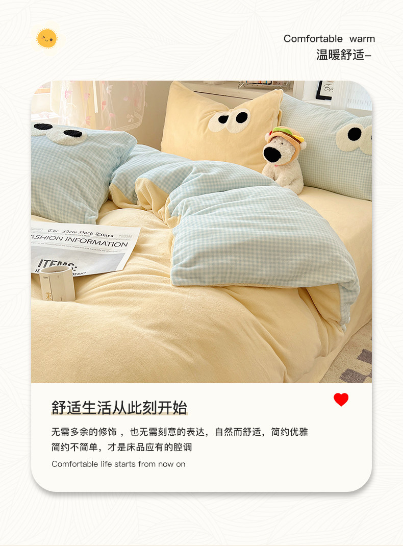 | Size specifications | [1.2 three-piece bed sheet set] quilt cover 150*200cm, sheets 180*230cm + one pillowcase,[four-piece set of small quilt labels for customized models] (note: suitable for 150×200 quilts) r velvet big eyes cute blue grid yellow,[1.5 bed sheet four-piece set] quilt cover 200*230cm bed sheets 230*250cm + 2 pillowcases,[1.8 bed sheet four-piece set] quilt cover 200*230cm bed sheets 230*250cm + 2 pillowcases,[1.5 fitted sheet set of four] quilt cover 200*230cm fitted sheet 150*200cm + 2 pillowcases,[1.8 fitted sheet set of four] quilt cover 200*230cm fitted sheet 180*200cm + 2 pillowcases,[2.0 bed sheet four-piece set] quilt cover 220*240cm bed sheets 230*250cm + 2 pillowcases |