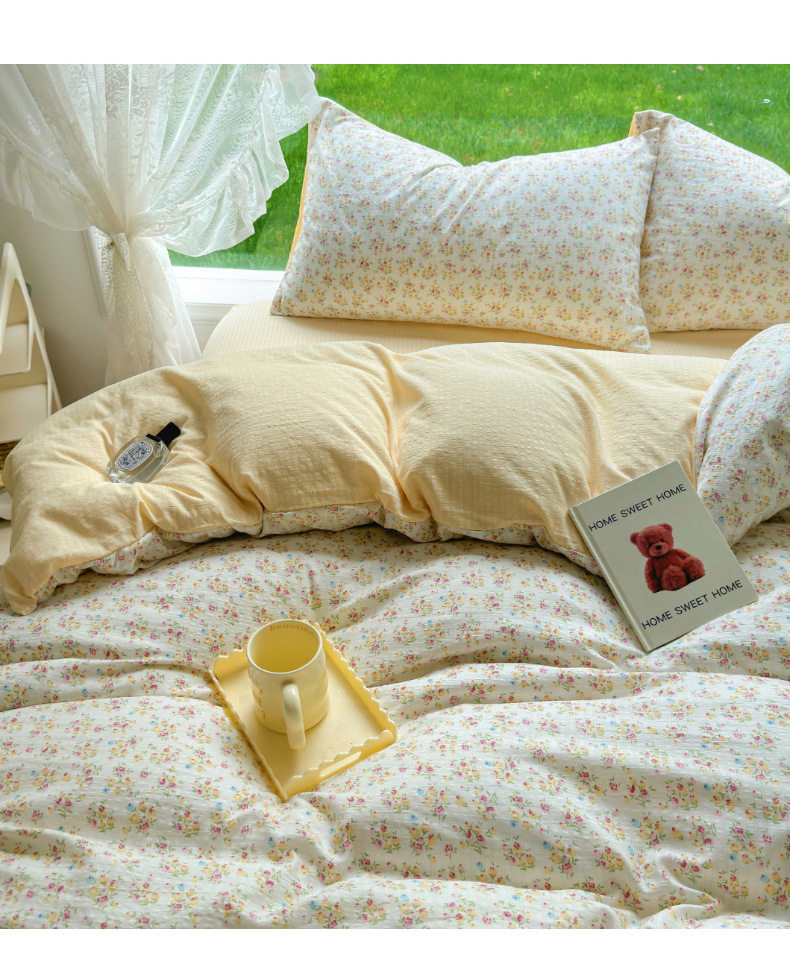 Class A small fresh color Zhu cotton four-piece set double-layer yarn small floral small Zhu cotton bed sheet quilt cover three-piece set bed hat