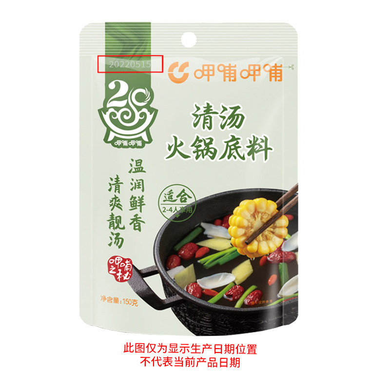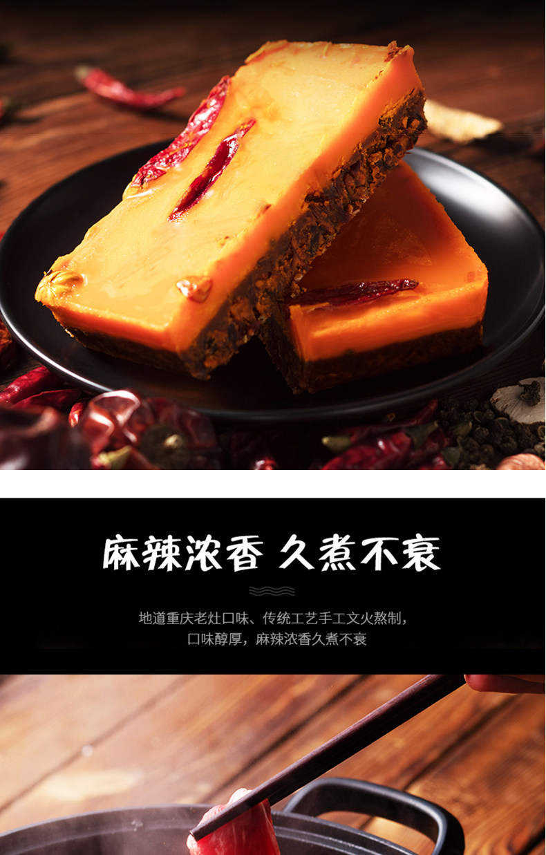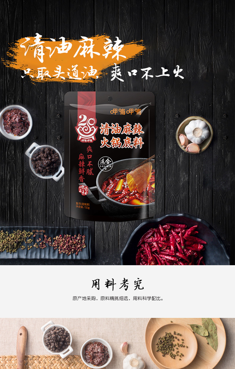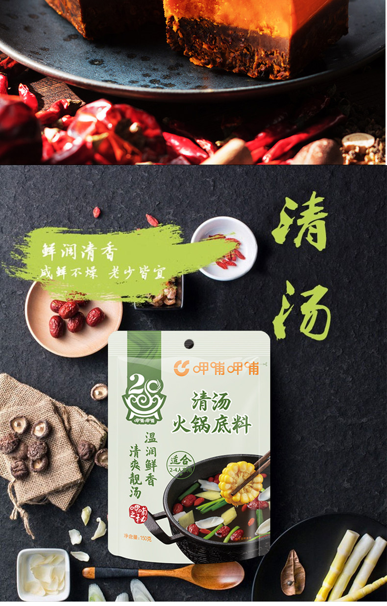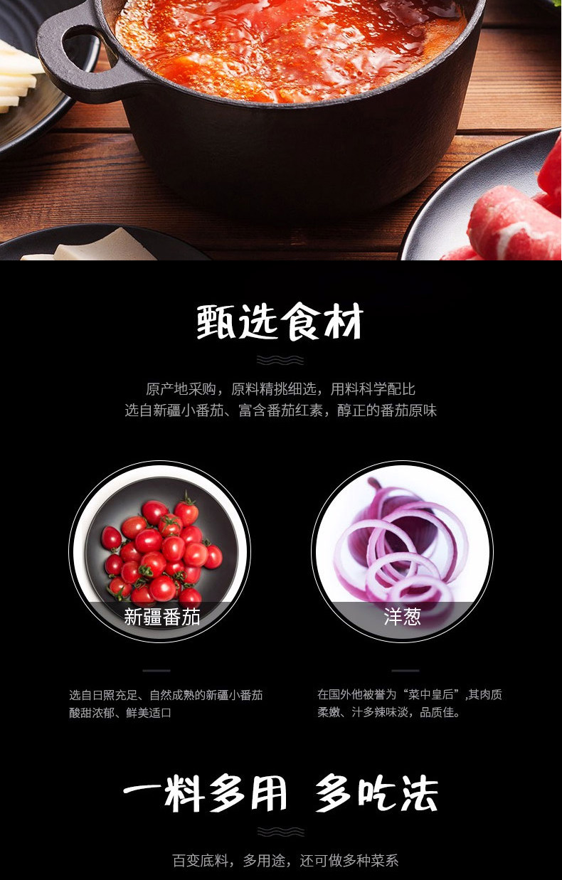 | Packaging specifications | Clear soup hot pot base 150g,Mushroom soup hot pot base 150g,Tomato hot pot base 150g,Clear oil spicy hot pot base 150g,Avocado spicy hot pot base 150g |