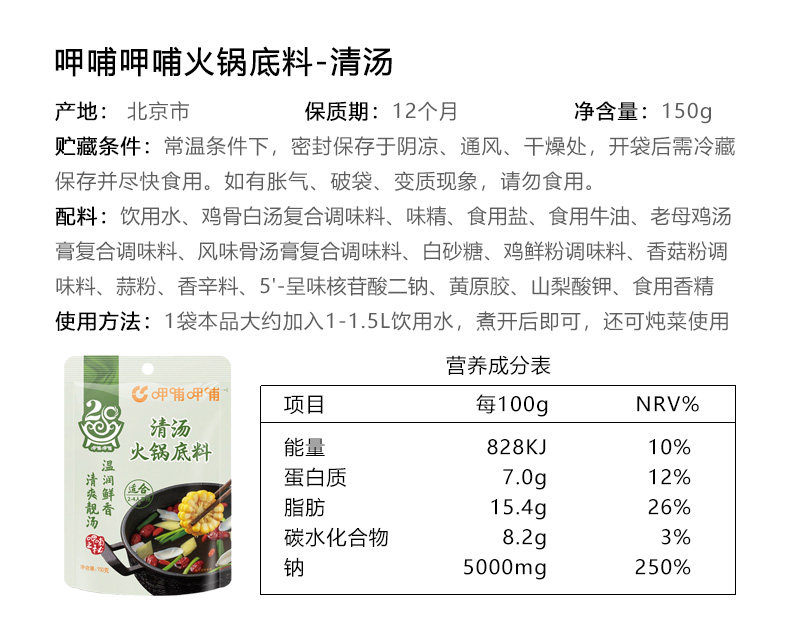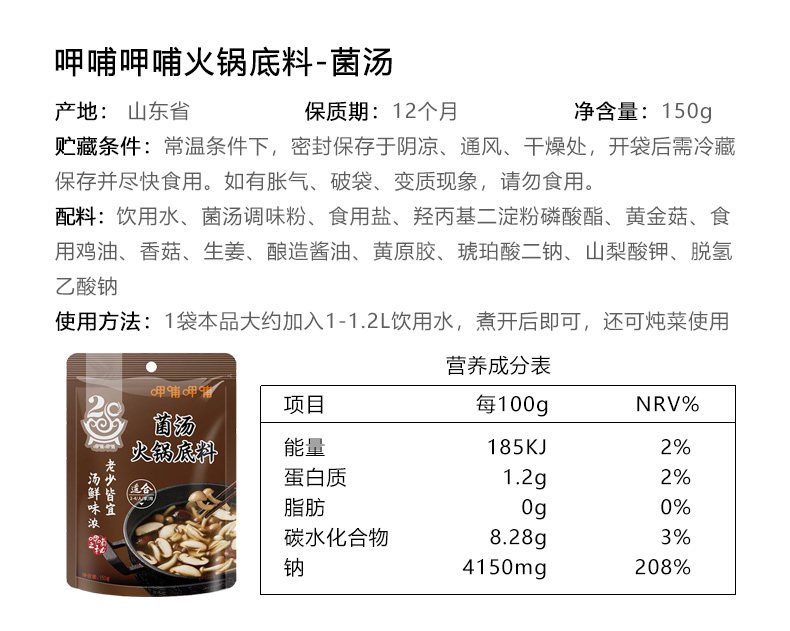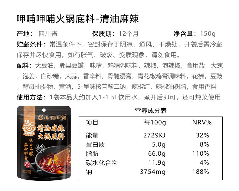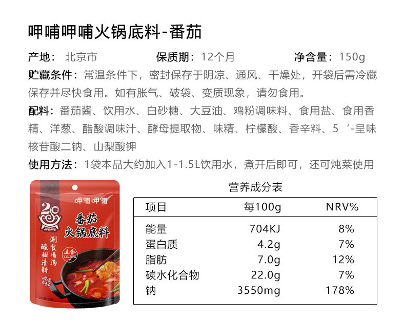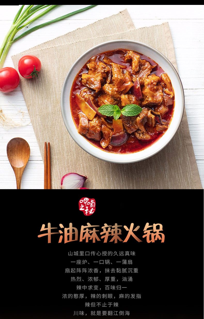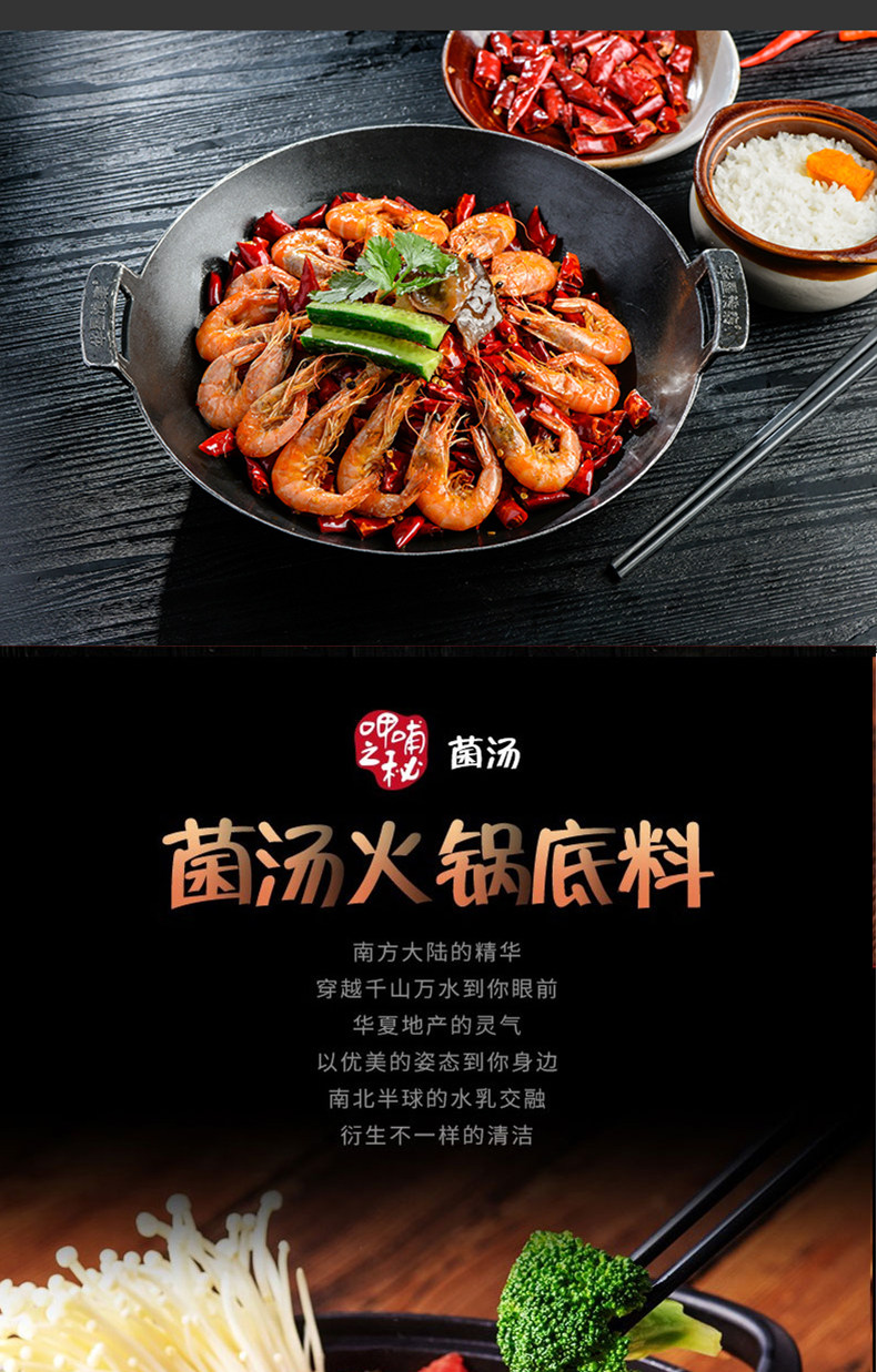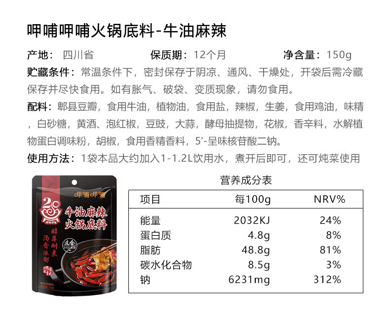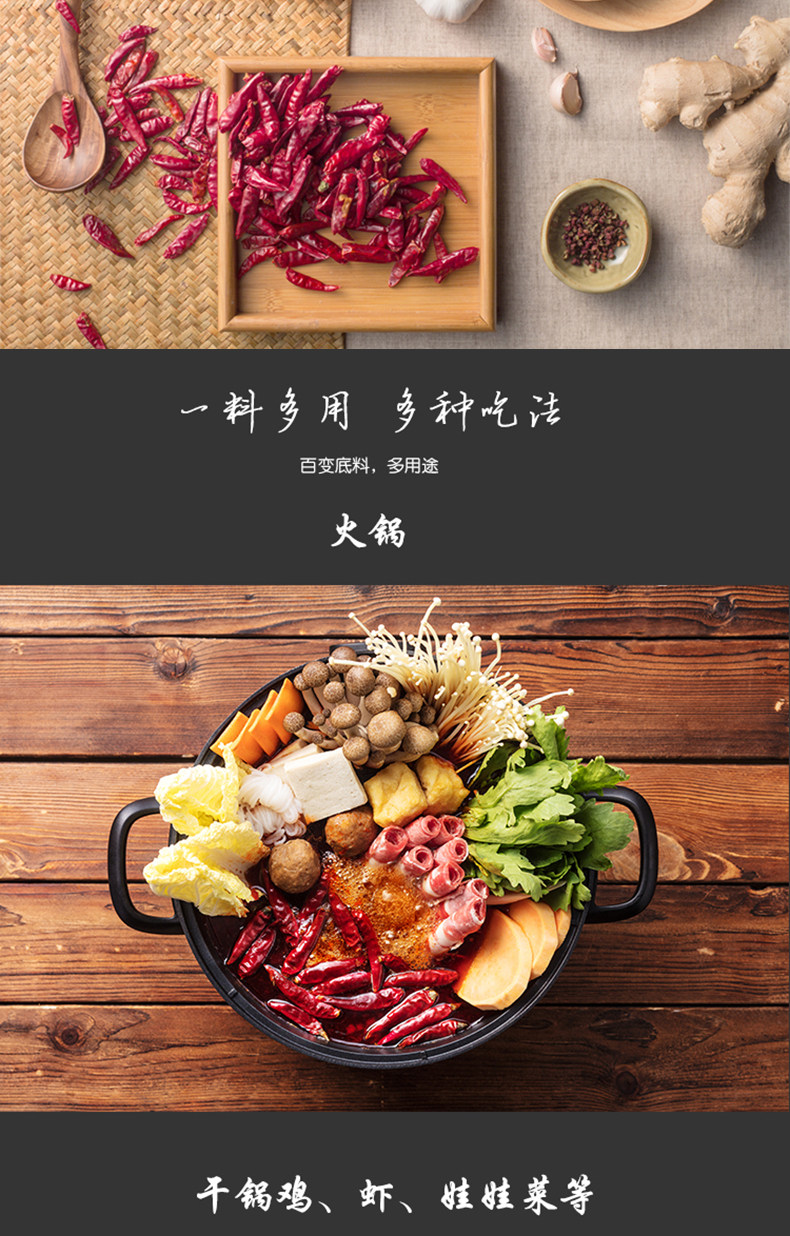 | Packaging specifications | Clear soup hot pot base 150g,Mushroom soup hot pot base 150g,Tomato hot pot base 150g,Clear oil spicy hot pot base 150g,Avocado spicy hot pot base 150g |
