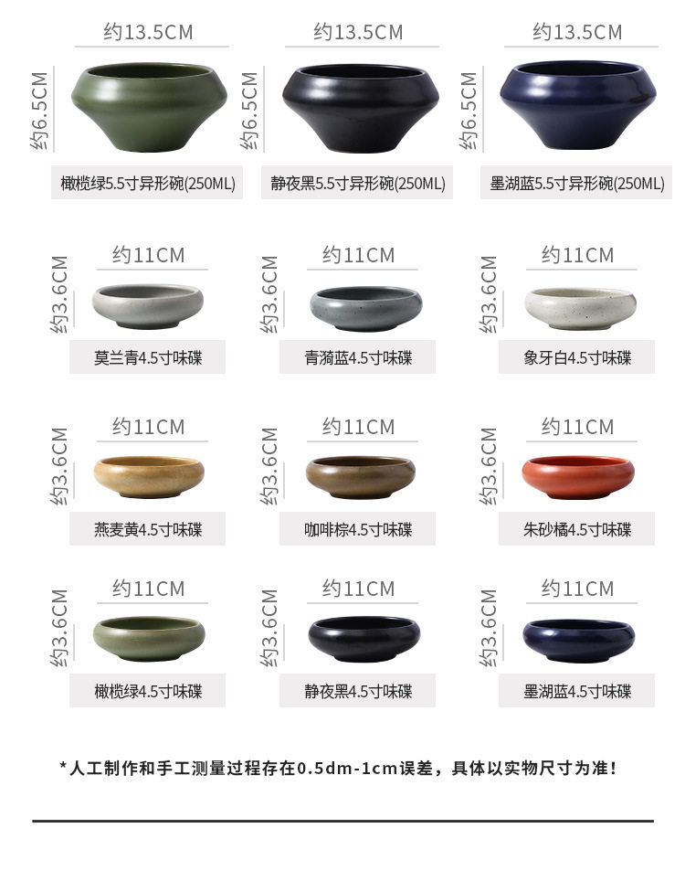 | Color | Bright sesame- 4.3inch flavor plate,Wuguangdangqing- 4.3inch flavor dishes,Fruit green- 4.3inch flavor plate,Orange - 4.3inch flavor plate,Gray blue- 4.3inch flavor plate,Kiln warm white - 4.3inch flavor dishes,Lacquer blue - 4.3inch flavored dishes,Lacquer black - 4.3inch flavor plate,Silver brown - 4.3inch flavor plate,Bright sesame- 5.3inch special bowl,Wuguangdangqing- 5.3inch special-shaped bowl,Fruit green- 5.3inch special shaped bowl,Orange - 5.3inch special shaped bowls,Gray blue- 5.3inch special bowl,Kiln warm white - 5.3inch shaped bowl,Wax orchid- 5.3inch special shaped bowl,Waxy black - 5.3inch shaped bowl,Silver brown - 5.3inch special shaped bowl |