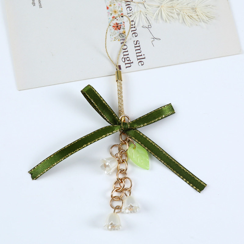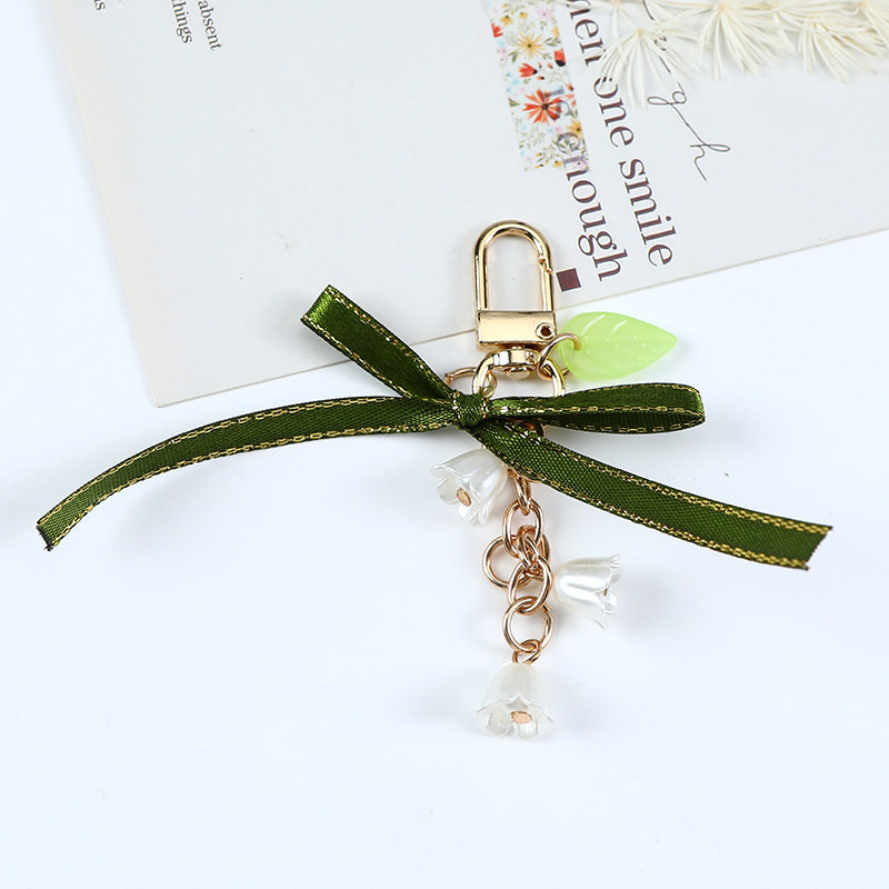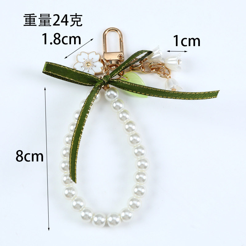 New Green Ribbon Car Keychain Pendant Creative Lily Flower Pearl Chain Hanging Headset Bag Decoration