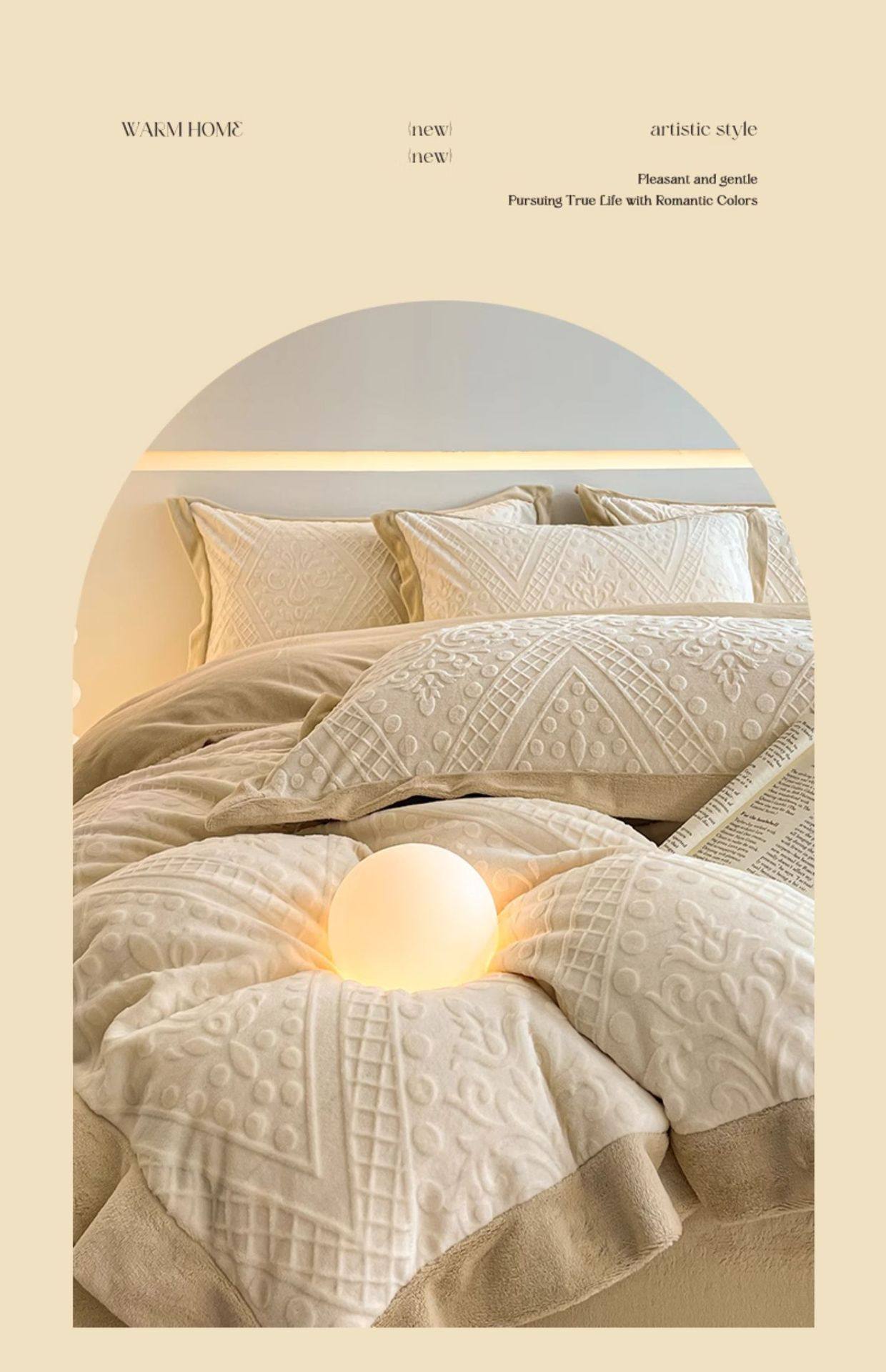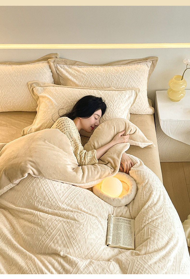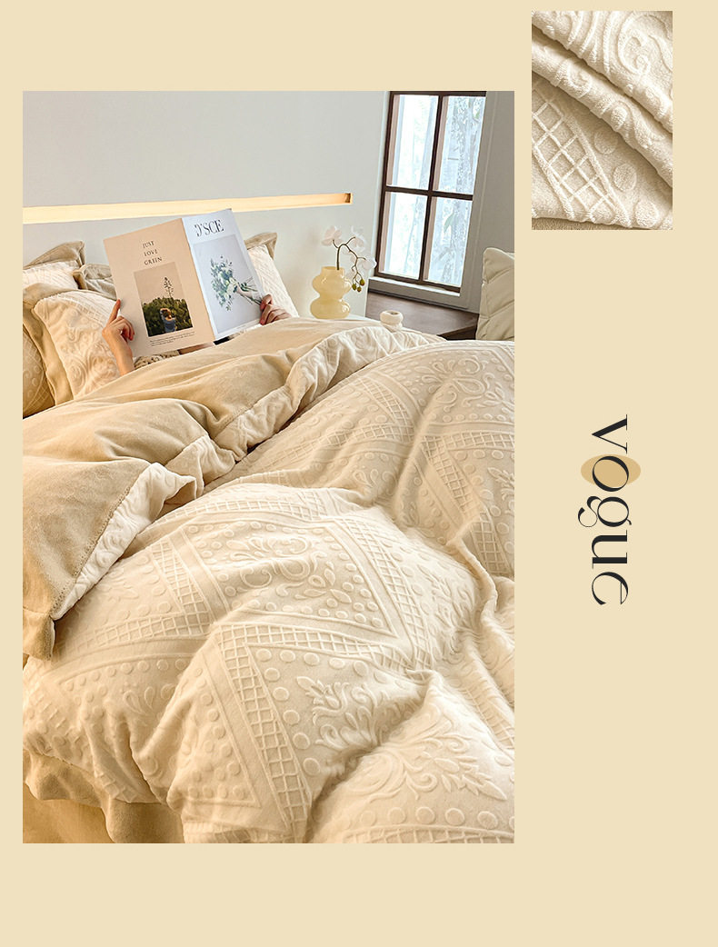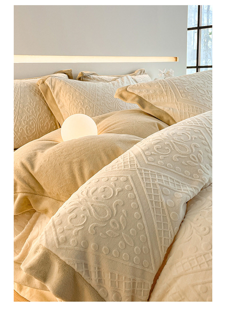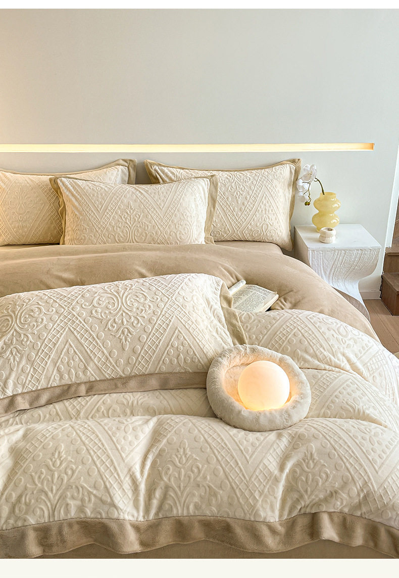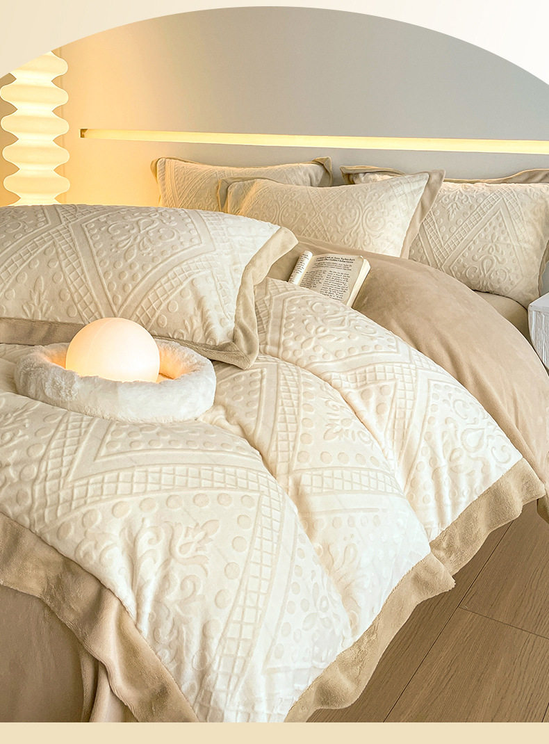 Light Luxury High-end Carved Milk Velvet Bed Four-piece Set Winter Coral Velvet Double-sided fleece-lined Bed Sheet Quilt Cover Three-piece Set