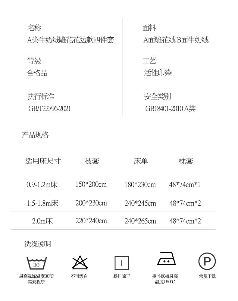 | Dimensions | 1.5m bed [sheet set of four pieces] - suitable for 200*230 quilt,1.8m bed [sheet set of four pieces] - suitable for 200*230 quilt,2.0m bed [sheet set of four pieces] - suitable for 220*240 quilt,1.5m bed [four-piece fitted sheet set] - suitable for 200*230 quilt,1.8m bed [four-piece fitted sheet set] - suitable for 200*230 quilt |
