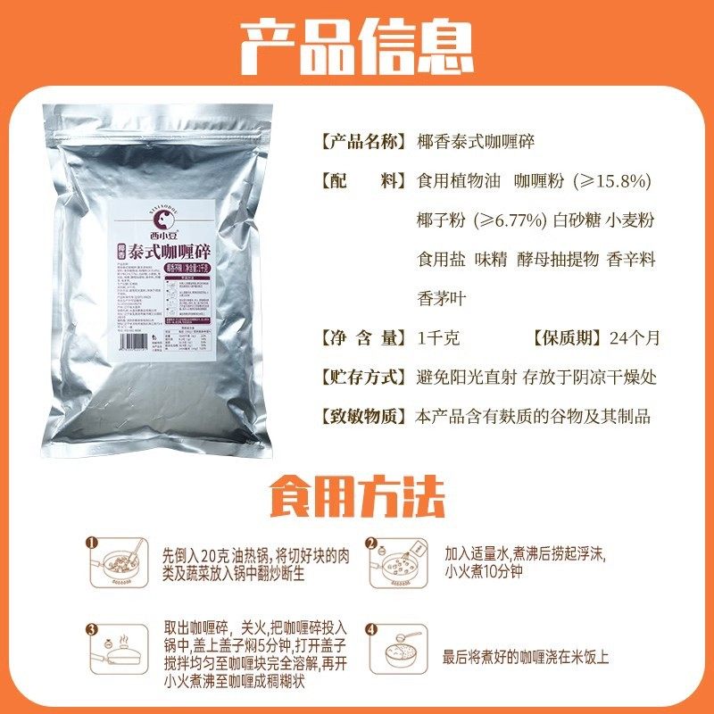 | Packaging specifications | Thai curry crush 1000g 1 bag,Coconut spicy 1kg*1 bag |