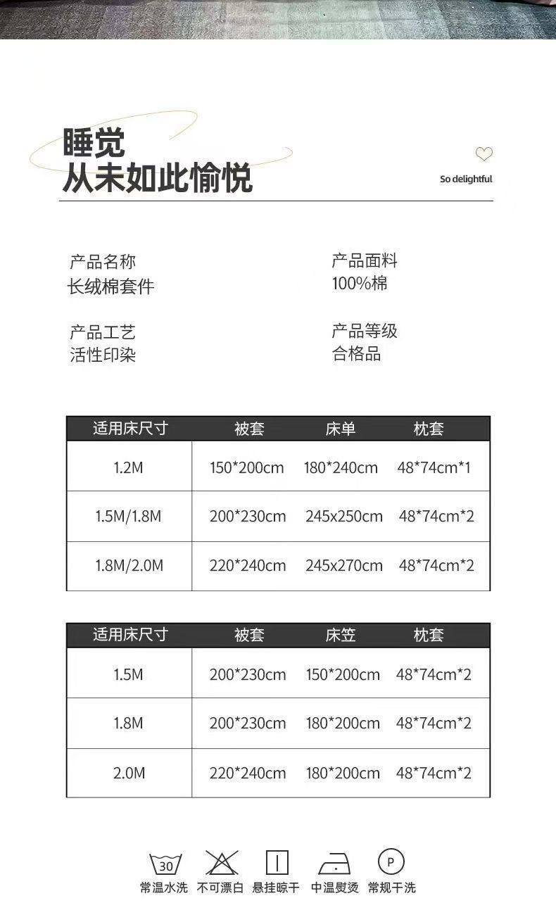 | Size specifications | Single quilt cover 150*200cm,Single quilt cover 200*230cm,Single quilt cover 220*240cm,Single quilt cover 150*200cm + a pair of pillowcases,Single quilt cover 200*230cm pair of pillowcases,Single quilt cover 220*240cm pair of pillowcases,1.2 sheets three-piece quilt cover set 150*200,1.5 sheets four-piece quilt cover 200x230,1.8 sheets four-piece quilt cover 200x230,2.mbed sheets four-piece quilt cover 220x240,1.5 fitted sheet quilt cover 200x230 four-piece set,1.8 fitted sheet quilt cover 200x230 four-piece set |