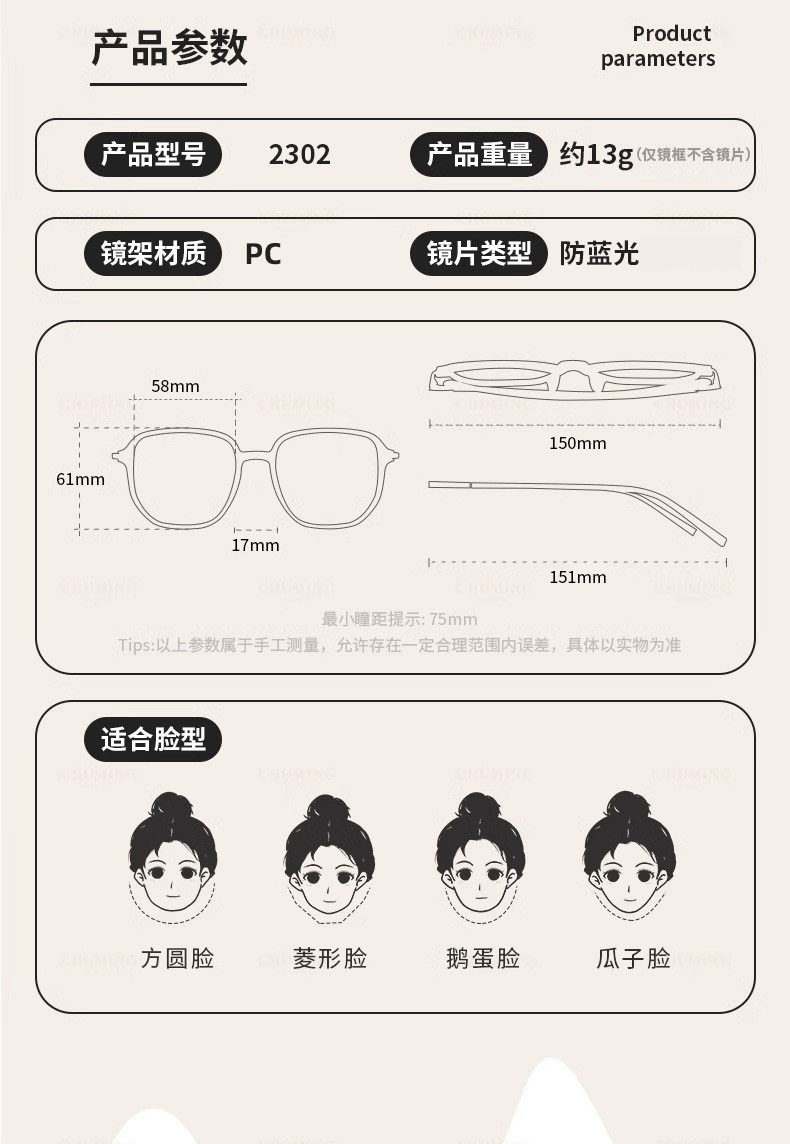 | Lens color | Glasses frame [without lining],Flat mirror [anti-blue light],Myopia glasses [50 degrees],Myopia glasses [100 degrees],Myopia glasses [150 degrees],Myopia glasses [200 degrees],Myopia glasses [250 degrees],Myopia glasses [300 degrees],Myopia glasses [350 degrees],Myopia glasses [400 degrees] |