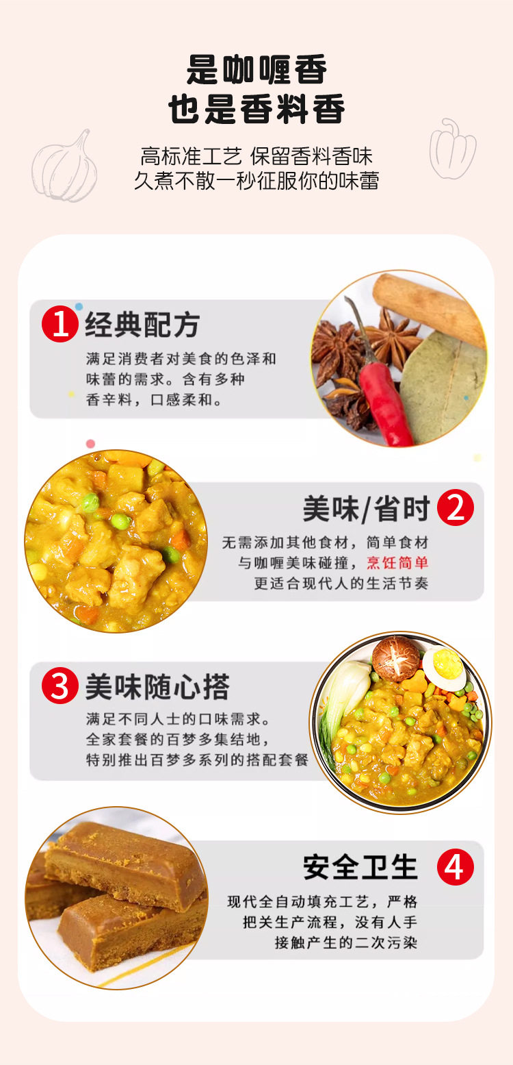 | Packaging specifications | 100g haoshi (original) curry cubes 1 box,100g haoshi (original) curry cubes 2 boxes,100g haoshi (original) curry cubes 3 boxes,100g haoshi (slightly spicy) curry cubes 1 box,100g haoshi (slightly spicy) curry cubes 2 boxes,100g haoshi (slightly spicy) curry cubes 3 boxes,100g haoshi (spicy) curry cubes 1 box,100g haoshi (spicy) curry cubes 2 boxes,100g haoshi (spicy) curry cubes 3 boxes,100g haoshi (remark flavor) curry cubes 2 boxes,100g haoshi (remark flavor) curry cubes 3 boxes,100g jiang xiaoou (original) curry cubes 1 box,100g jiang xiaoou (original) curry cubes 2 boxes,100g jiang xiaoou (original) curry cubes 3 boxes,100g sauce xiaoou (slightly spicy) curry cubes 1 box,100g jiang xiaoou (slightly spicy) curry cubes 2 boxes,100g jiang xiaoou (slightly spicy) curry cubes 3 boxes,100g sauce xiaoou (spicy) curry cubes 1 box,100g sauce xiaoou (spicy) curry cubes 2 boxes,100g sauce xiaoou (spicy) curry cubes 3 boxes,100g jiang xiaoou (remark flavor) curry cubes 2 boxes,100g jiang xiaoou (remark flavor) curry cubes 3 boxes |
