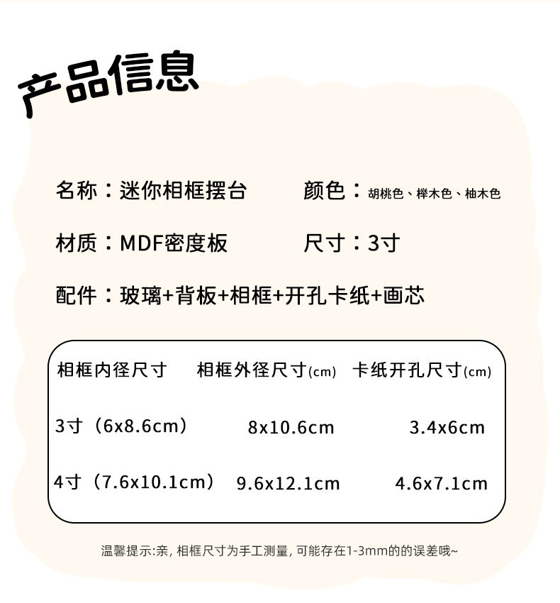 | Frame size | 3inch (inner diameter: 6*8.6cm) table setting,4inch (inner diameter 7.6*10.1cm) table setting |