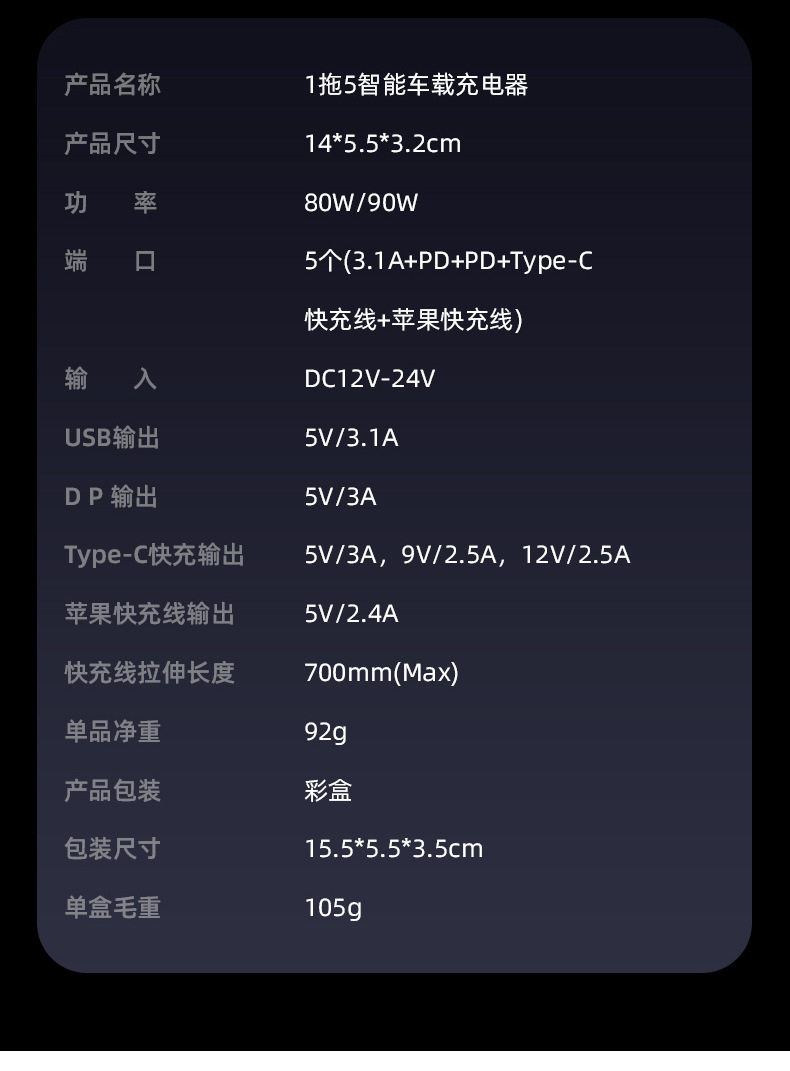 | Model | [apple cable + type-c cable + double c port + a port] total 80w,[dual type-c cable + double c port + a port] total 90w,[apple cable + type-c fast charging cable + a port + c port] total 84w |