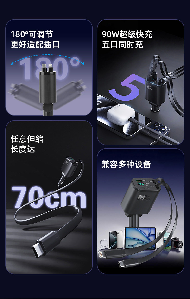 Car Charger with Cable, One to Five Car Charger, Super Fast Charging Car Cigarette Lighter, Mobile Phone Charger with Retractable Cable