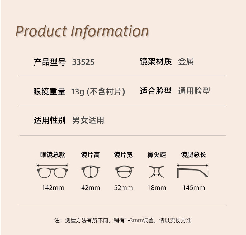 | Frame color | Classic black c1,Literary gold c2,Rose gold c3,Cool silver c4,Black silver c6,Gun gray c9 |