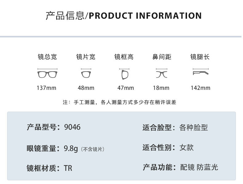 9046 New Korean Tr Glasses Frame, Versatile for Men and Women with Square and Round Faces, No Makeup, Slimming Look, Can Be Equipped with Myopia Lenses