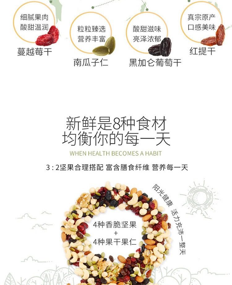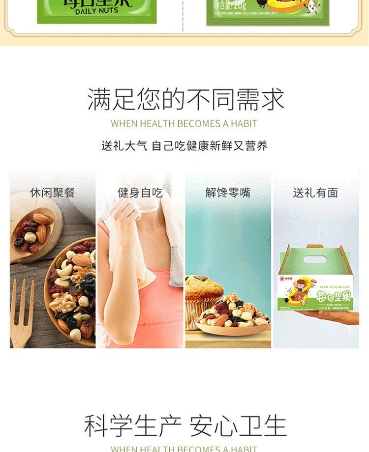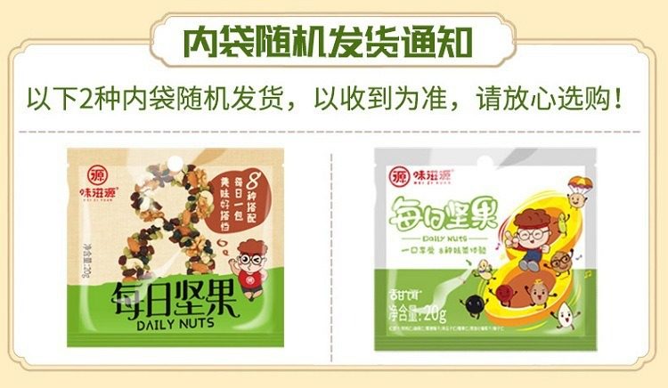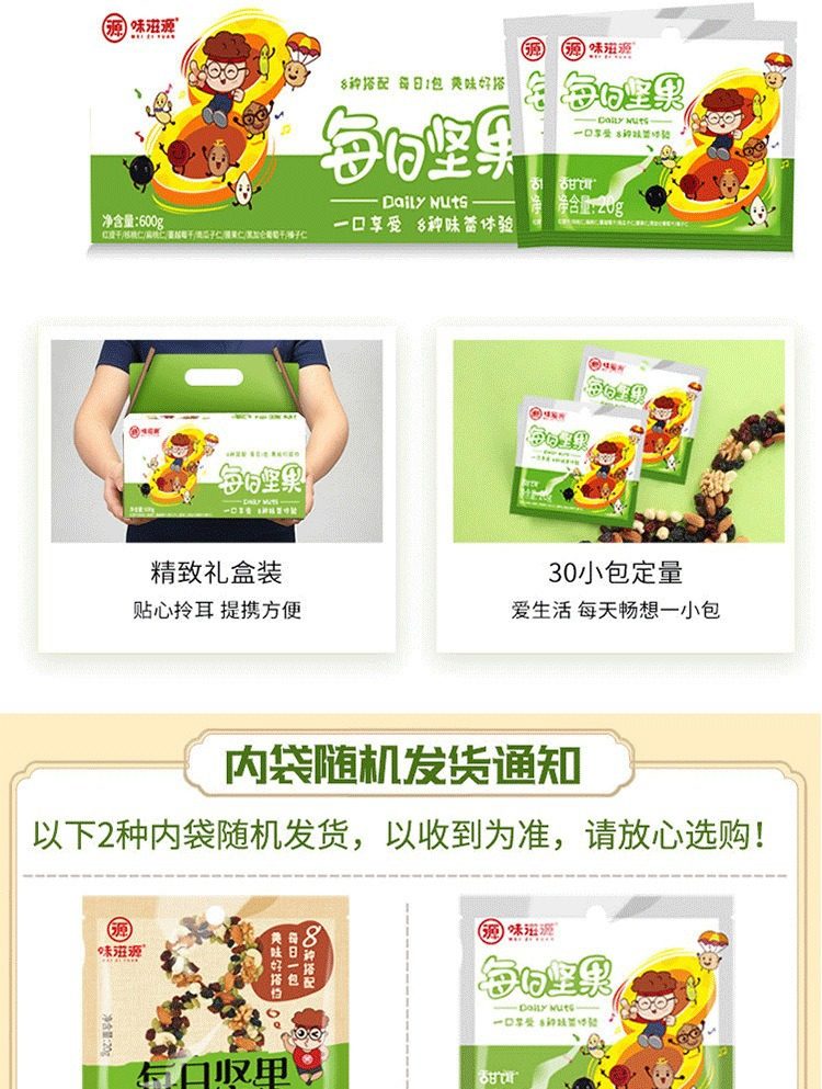 | Packaging specifications | Daily nuts (30 bags) 600g,Daily nuts (portable) 520g |
