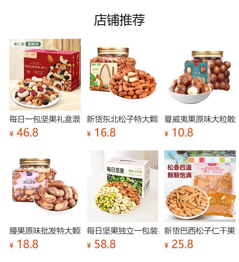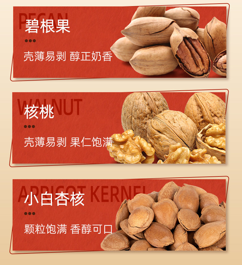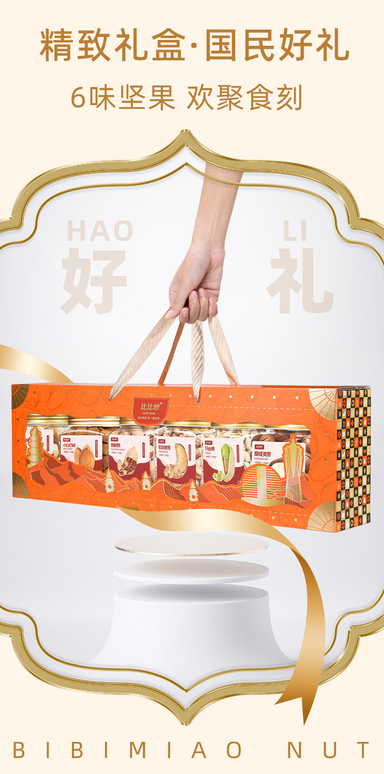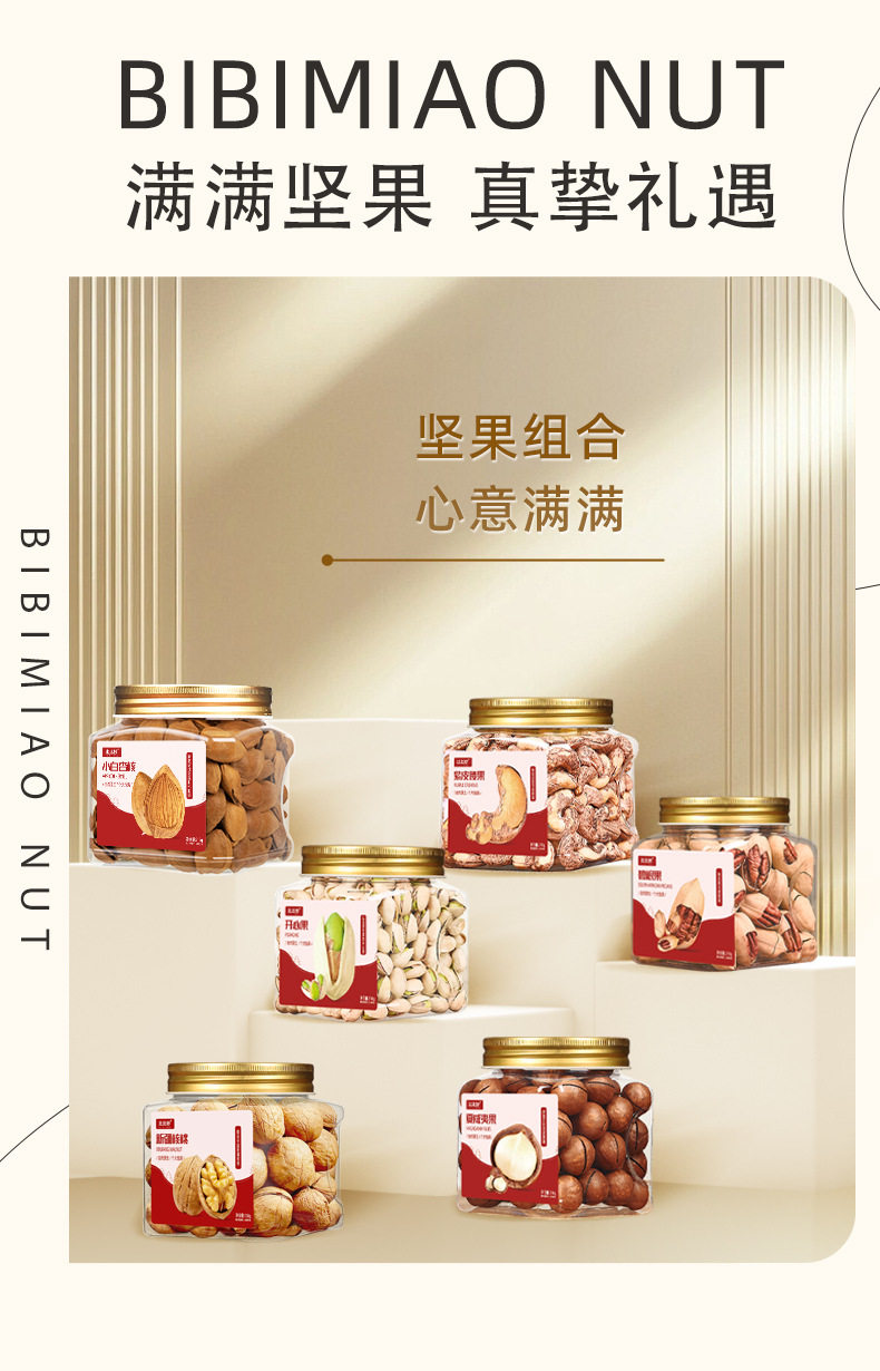 | Packaging specifications | 1248g [nut gift box as style] pistachios + cashews + summer nuts + pecans + white apricot nuts + large walnuts (1 can each),1308g [national gift box type e] cashew nuts + pecans + macadamia nuts + hand peeled almonds + white apricots + amber walnut kernels,1308g [national gift box type b] dongsong + cashew + pistachio + walnut kernel + macadamia nut + hand peeled almond,Daily nuts 218g*1 can [premium canned],National gift box p type [waist, torreya, hazelnut, apricot, summer, big walnut] |
