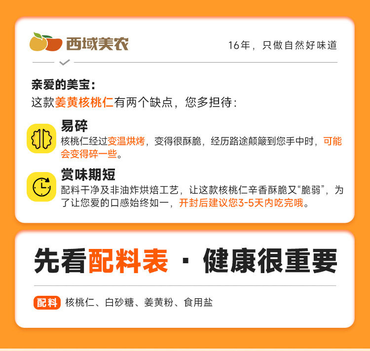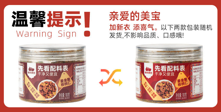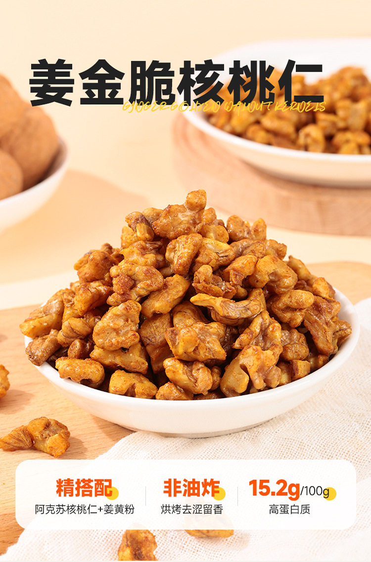 | Packaging specifications | Turmeric crispy walnut kernels 100g*1 can,Turmeric crispy walnut kernels 100g*2 cans,[new items will receive 1 can, get 4 cans] turmeric crispy walnut kernels 100g*3 cans |