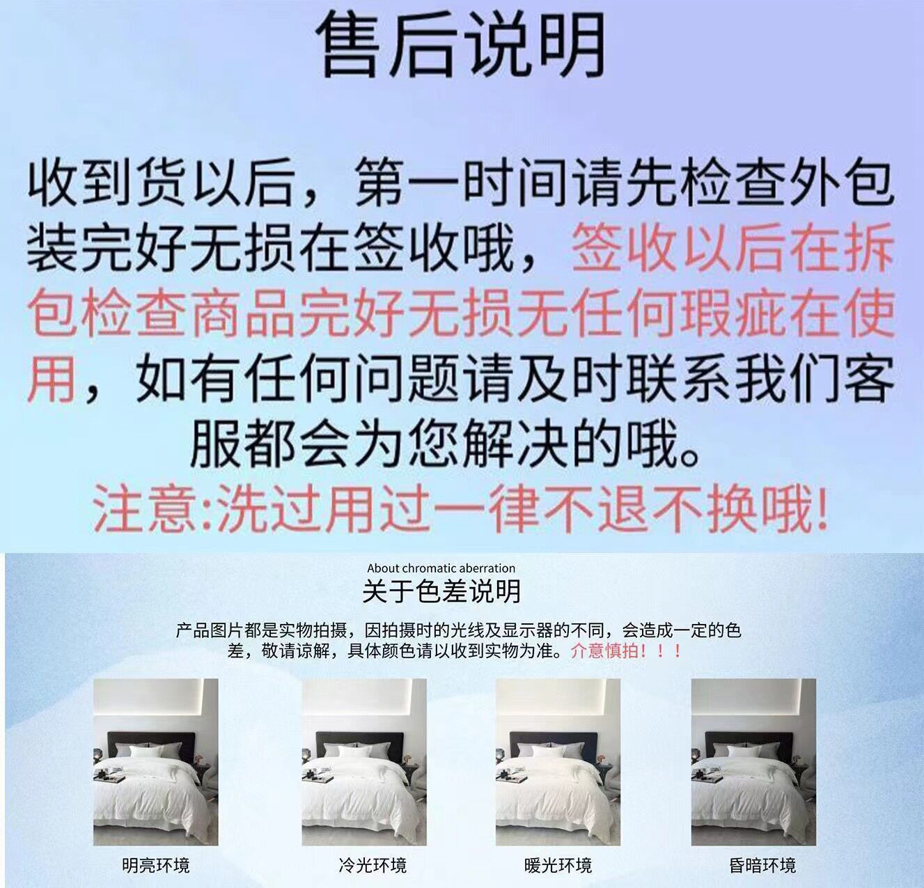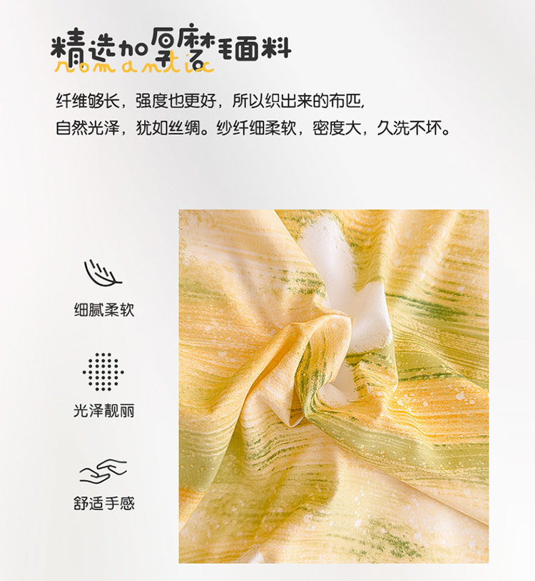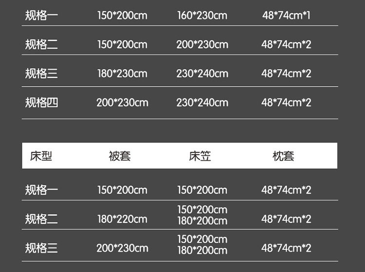 | Size specifications | 1.2m three-piece bed sheet set (quilt cover 150*200) [skin-friendly * can sleep naked],1.5m four-piece bed sheet set (quilt cover 150*200) [skin-friendly * can sleep naked],1.8m four-piece bed sheet set (quilt cover 180*220) [skin-friendly* can sleep naked],2.0m four-piece bed sheet set (quilt cover 200*230) [skin-friendly* can sleep naked],2.2m four-piece bed sheet set (quilt cover 220*240) [skin-friendly * can sleep naked],1.5m fitted sheet (quilt cover 200x230) [skin-friendly * can sleep naked],1.8m fitted sheet (quilt cover 200x230) [skin-friendly * can sleep naked],(single quilt cover 150x200cm) [skin-friendly *can sleep naked],(single quilt cover 180x220cm) [skin-friendly * can sleep naked],(single quilt cover 200x230cm) [skin-friendly *can sleep naked],(single quilt cover 220x240cm) [skin-friendly * can sleep naked] |