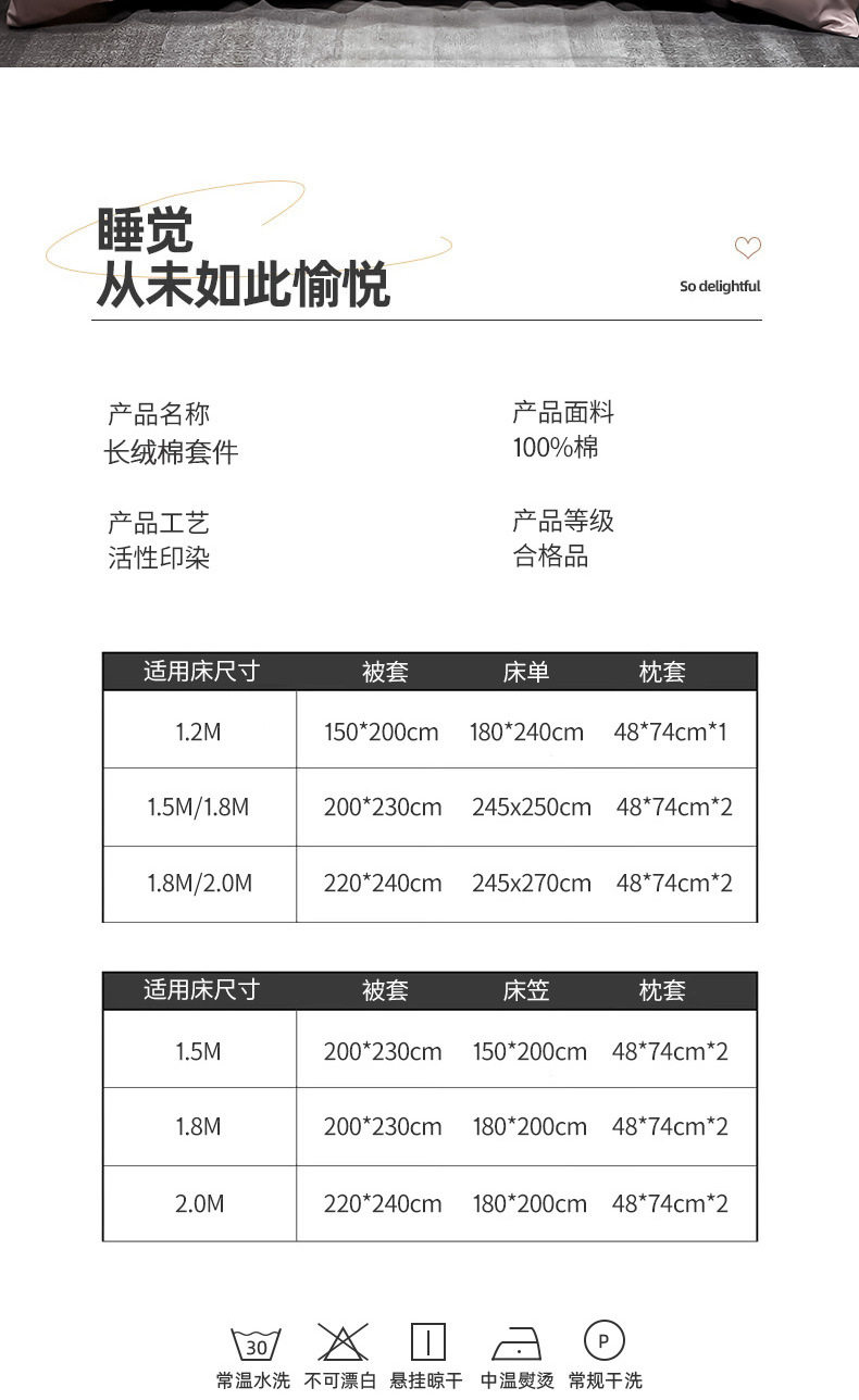 | Size specifications | 1.2m [three-piece bed sheet set] quilt cover 150x200,1.5m [four-piece bed sheet set] quilt cover 200x230,1.8m [four-piece bed sheet set] quilt cover 200x230,2.0m [four-piece bed sheet set] quilt cover 220x240c,1.5m [fitted sheet set of four] quilt cover 200x230,1.8m [four-piece fitted sheet set] quilt cover 200x230,Special 1.8 [four-piece fitted sheet set] quilt cover 220x240 |
