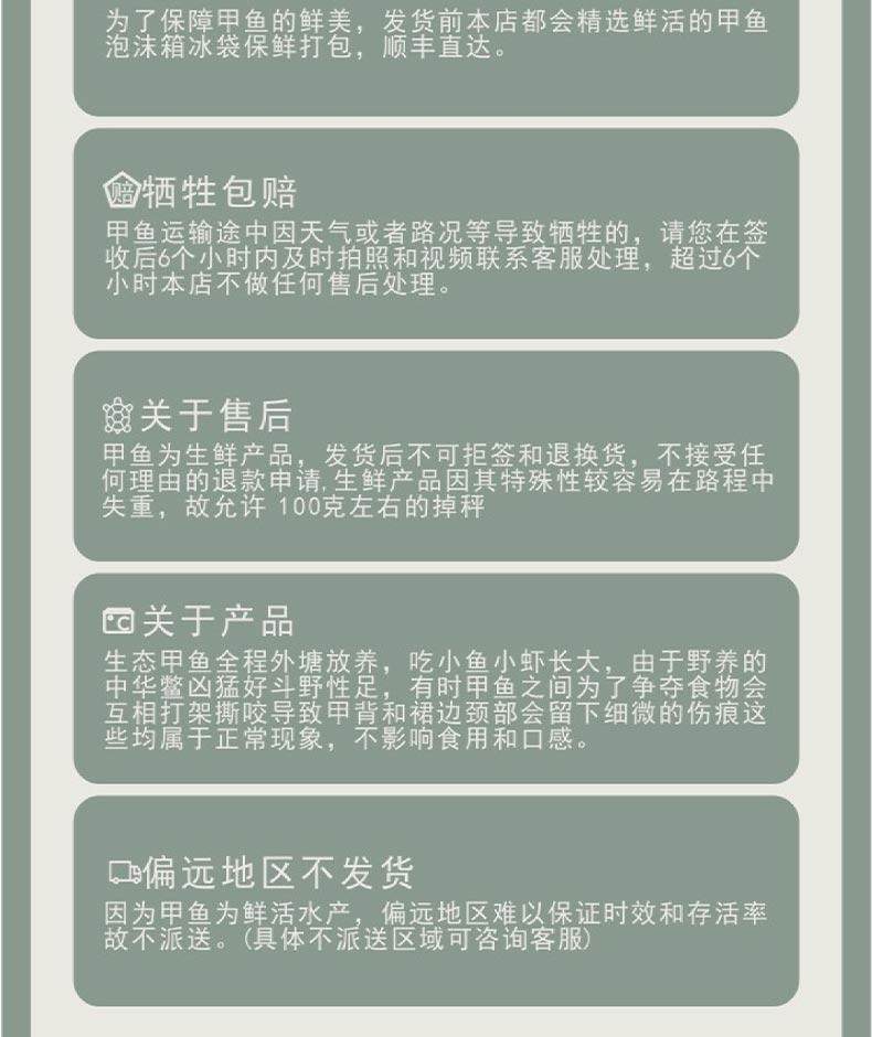 | Packaging specifications | 0.5-0.65kg fresh turtle,0.65-0.75kg fresh turtle,0.75-0.9kg fresh turtle,0.9-1.0kg fresh turtle,1.0-1.1kg fresh turtle,1.1-1.2kg fresh turtle,1.2-1.4kg fresh turtle,1.4-1.5kg fresh turtle,1.8-2kg fresh turtle |
