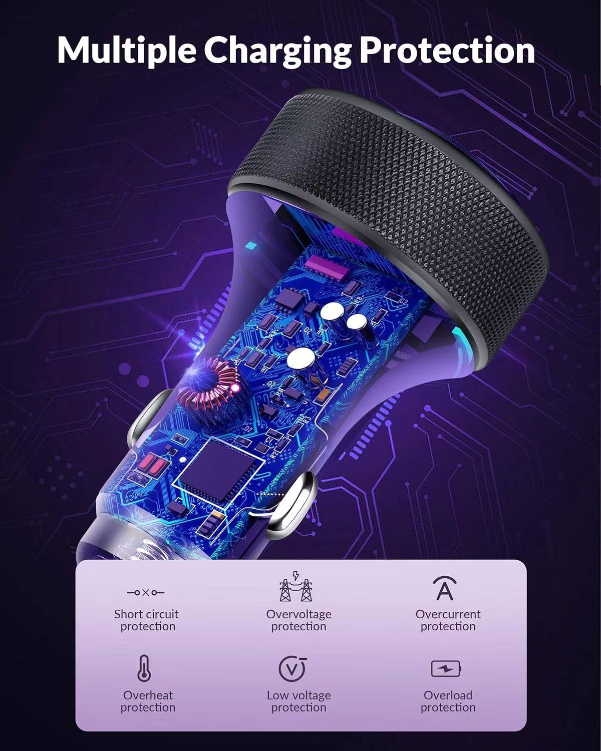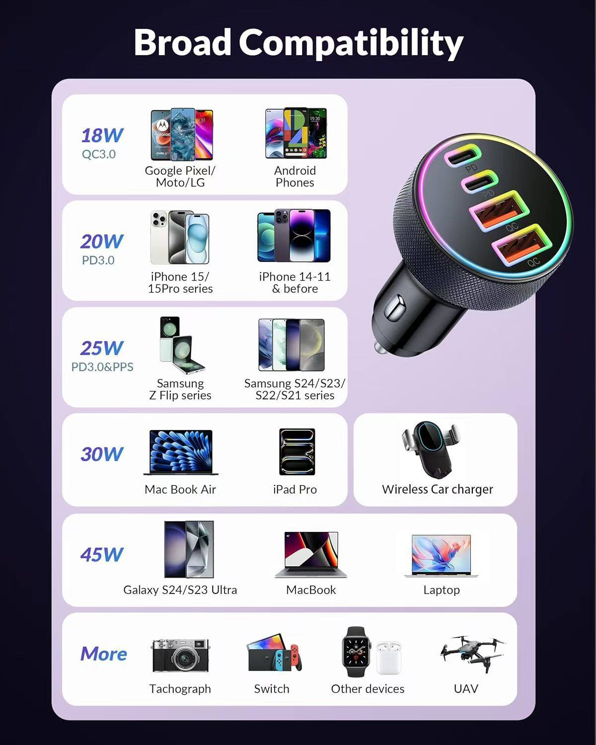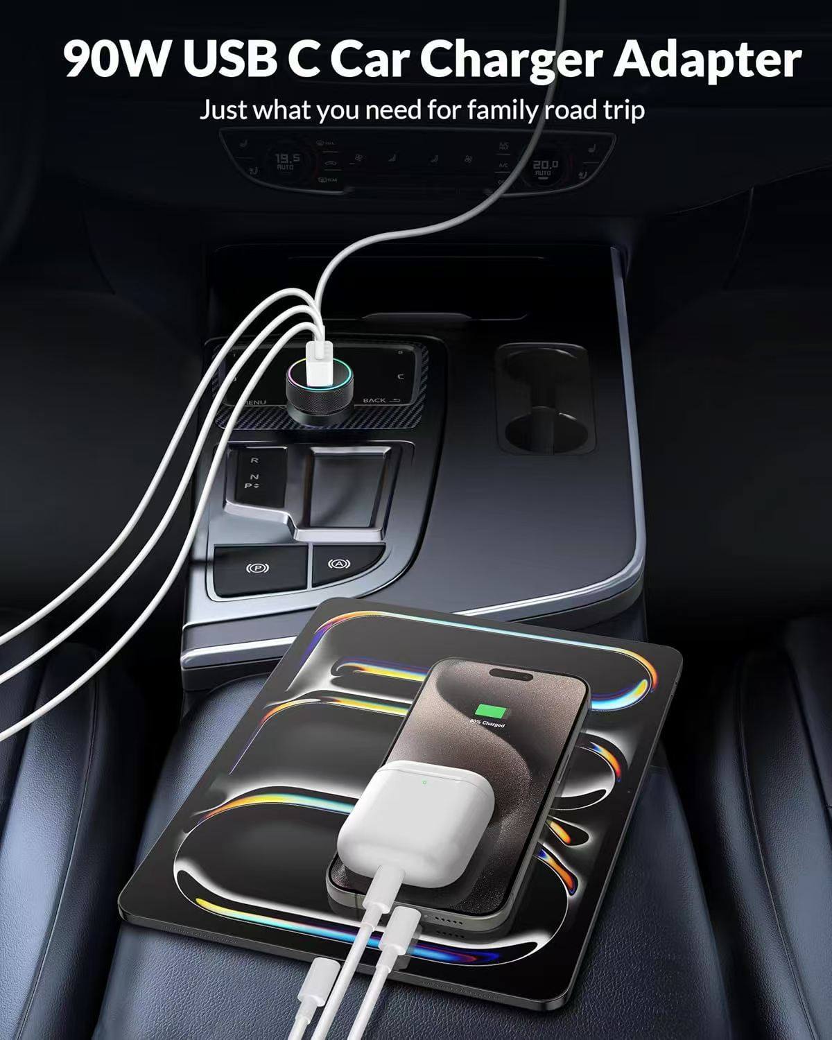 Cross-Border Hot-Selling Aluminum Alloy Car Charger One-To-Four Fast Charging Dual Qc3.0 Metal Car Charger High Power
