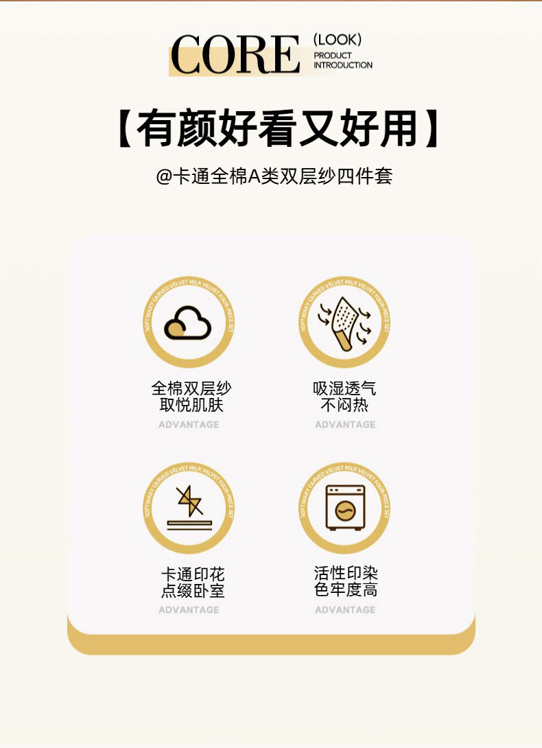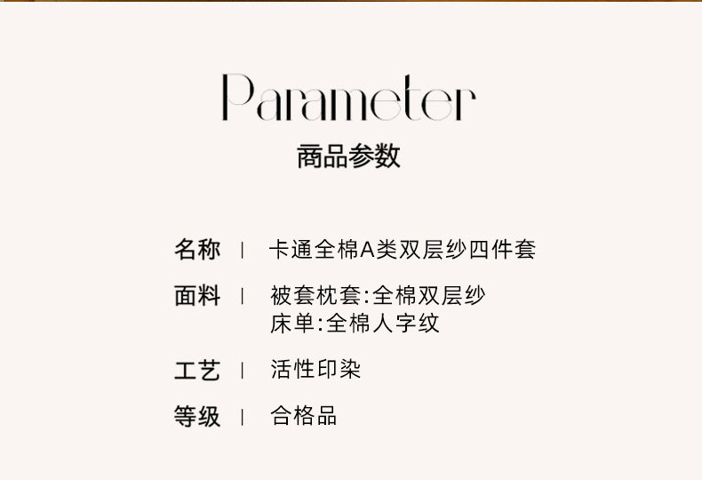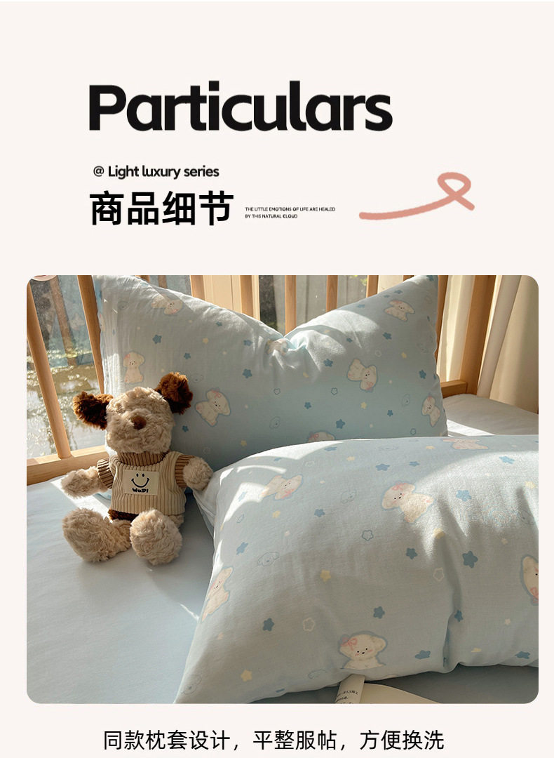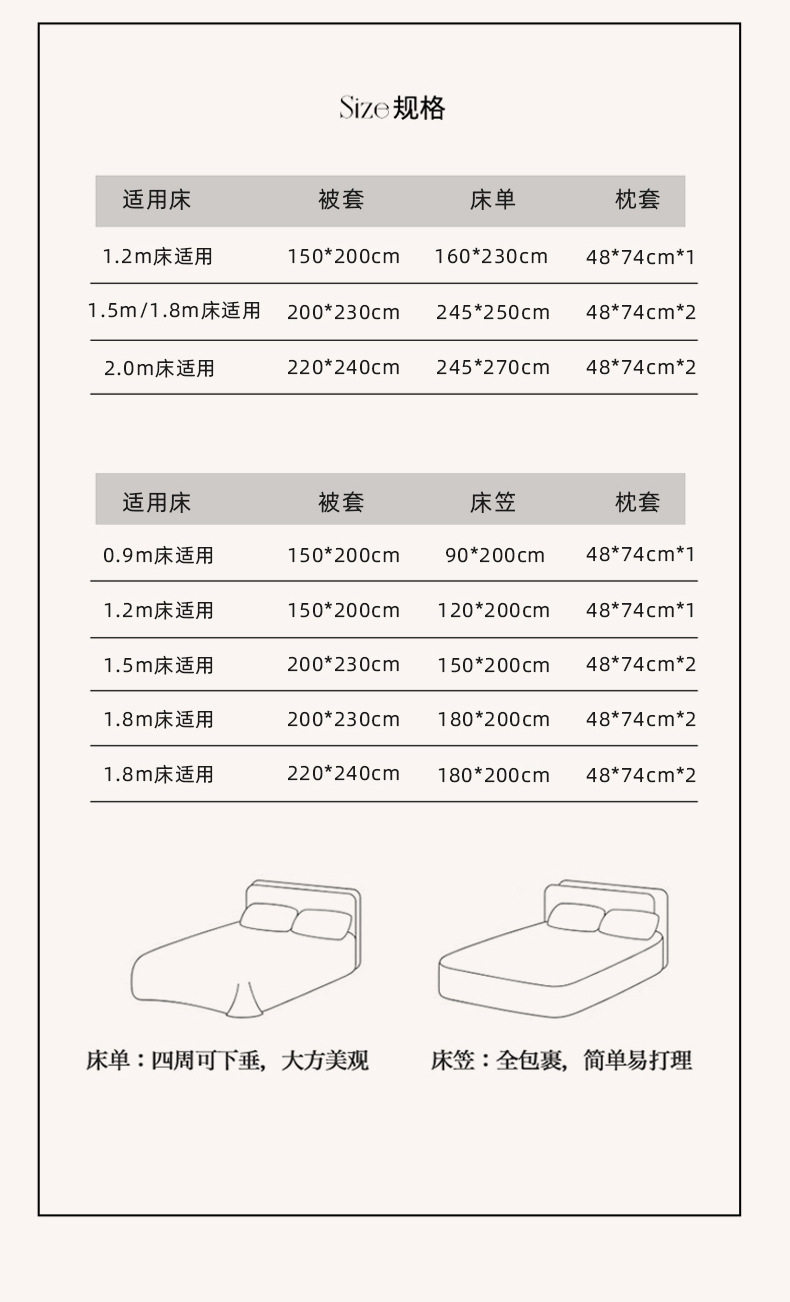 | Dimensions | 1.5m bed sheet four-piece quilt cover (200*230),1.8m bed sheet four-piece quilt cover (200*230),2.0m bed sheet four-piece quilt cover (220*2400,1.5m fitted sheet set of four quilt covers (200*230),1.8m fitted sheet set of four quilt covers (200*230),A pair of pillowcases 48*74,1.8m fitted sheet quilt cover with enlarged (220*240) four-piece set,0.9* 2m three-piece fitted sheet set (quilt cover 150*200),0.9-1.2m bed sheet three-piece quilt cover (150*200),1.2 fitted sheet three-piece quilt cover (150*200) |