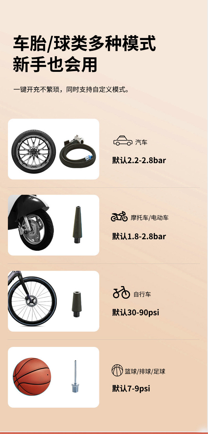 | Additional features | Lighting,Tire pressure gauge,Warning light |