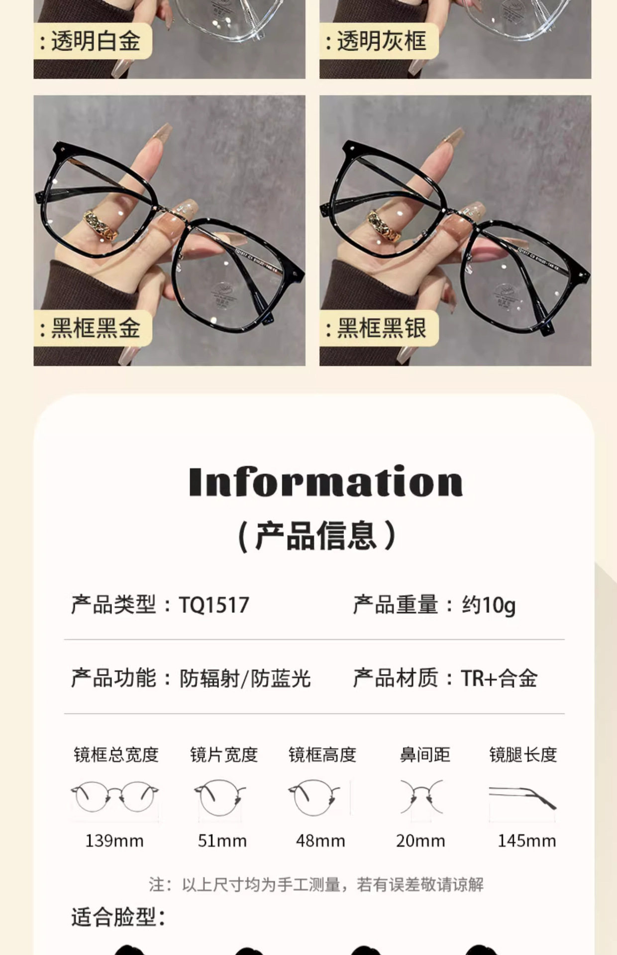 | Frame color | Quality tr-whitening olive green,Quality tr-cold tea champagne,Quality tr-fashionable gray,Quality tr-saint clear gold,Quality tr-transparent silver,Quality tr-black frame black gold,Quality tr-black frame black silver,Equipped with myopia or brand yishilu wanxin/consult customer service |