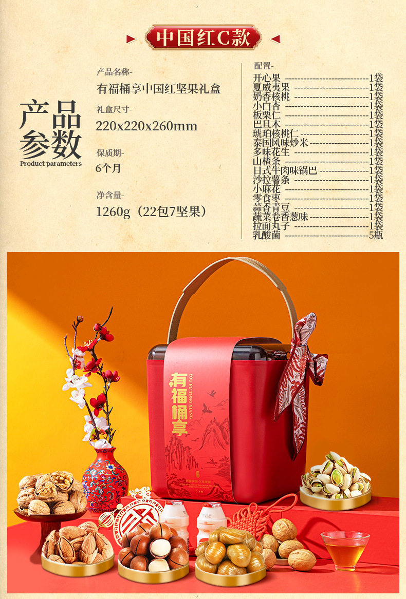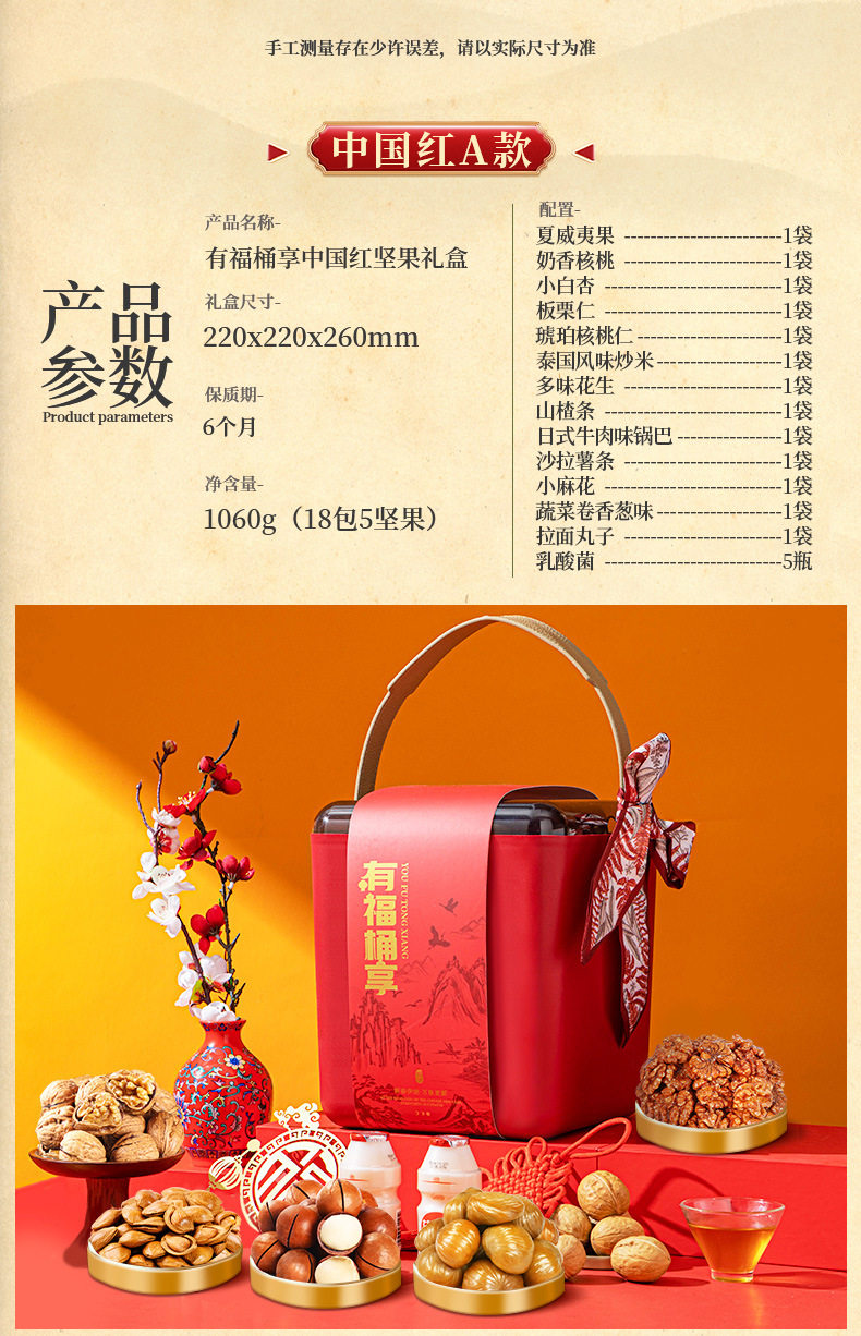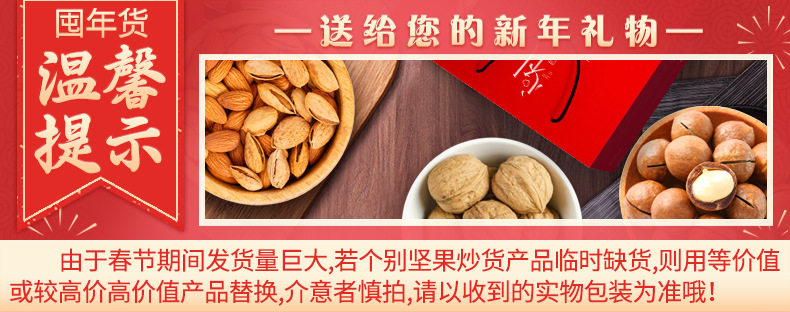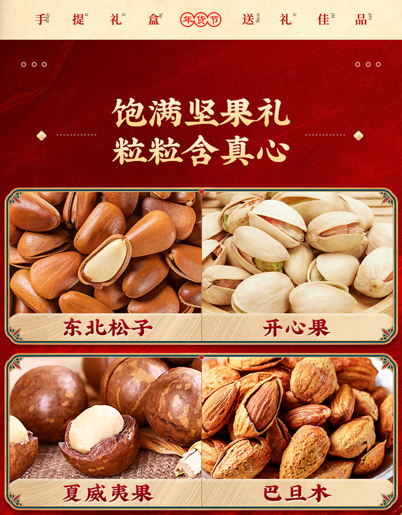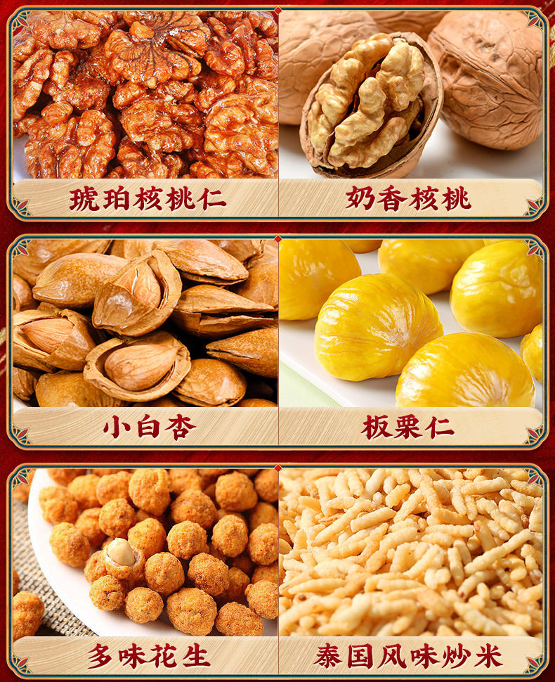 | Packaging specifications | Luxury gift set: 16 packs of assorted nuts,Golden lion happy new year 16 packs of 3 nuts,Chinese new year lion dance style 16-pack 3-nut gift set,Chinese new year lion dance style 18 packs of 4 nuts,Chinese new year lion dance style 20 packs of 5 nuts,Chinese new year lion dance style 22 pack of 6 nuts,Chinese new year lion dance style 24 pack 7 nuts,Chinese new year lion dance style 26 packs 8 nuts,Golden lion happy new year 15 packs of pure nuts,Wealth and fortune arrive: 18 packs of 4 nuts,Golden lion happy new year 20 packs of 5 nuts,Congratulations on getting rich chinese red type a 18 packs of 4 nuts,Congratulations on getting rich chinese red type b 20 packs of 5 nuts,Congratulations on getting rich chinese red c style 22 packs of 6 nuts,Congratulations on getting rich chinese red d style 24 packs of 7 nuts,Congratulations on the chinese new year double layer 11 pack of 4 nuts,Congratulations on the chinese new year! chinese red three-layered gift box with 15 packs of 6 nuts,Parrot green luggage 18-pack with 6 nuts,China red luggage 18-pack with 6 nuts,China red luggage 22 pack 8 nuts,Portable luxury gift box olive green style 13 packs of 7 nuts,Portable luxury gift box elegant orange style 13 packs of 7 nuts,Portable light luxury gift box elegant orange style 13 packs 8 nuts style b,Portable luxury gift box blue and white style 13 packs of 7 nuts,16 packs of 5 nuts for good luck,Moonlight rhyme chinese red 10 packs of 5 nuts,Moonlight rhyme olive green 10-pack with 5 nuts |