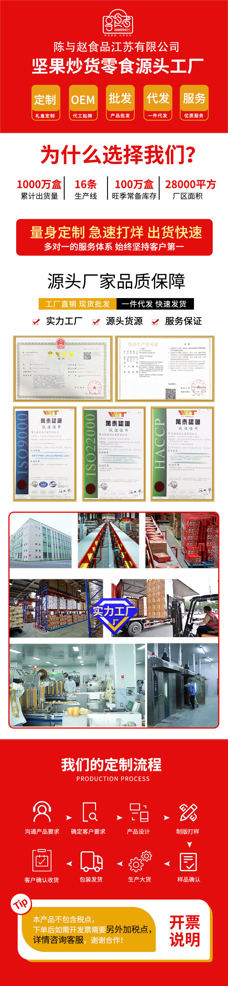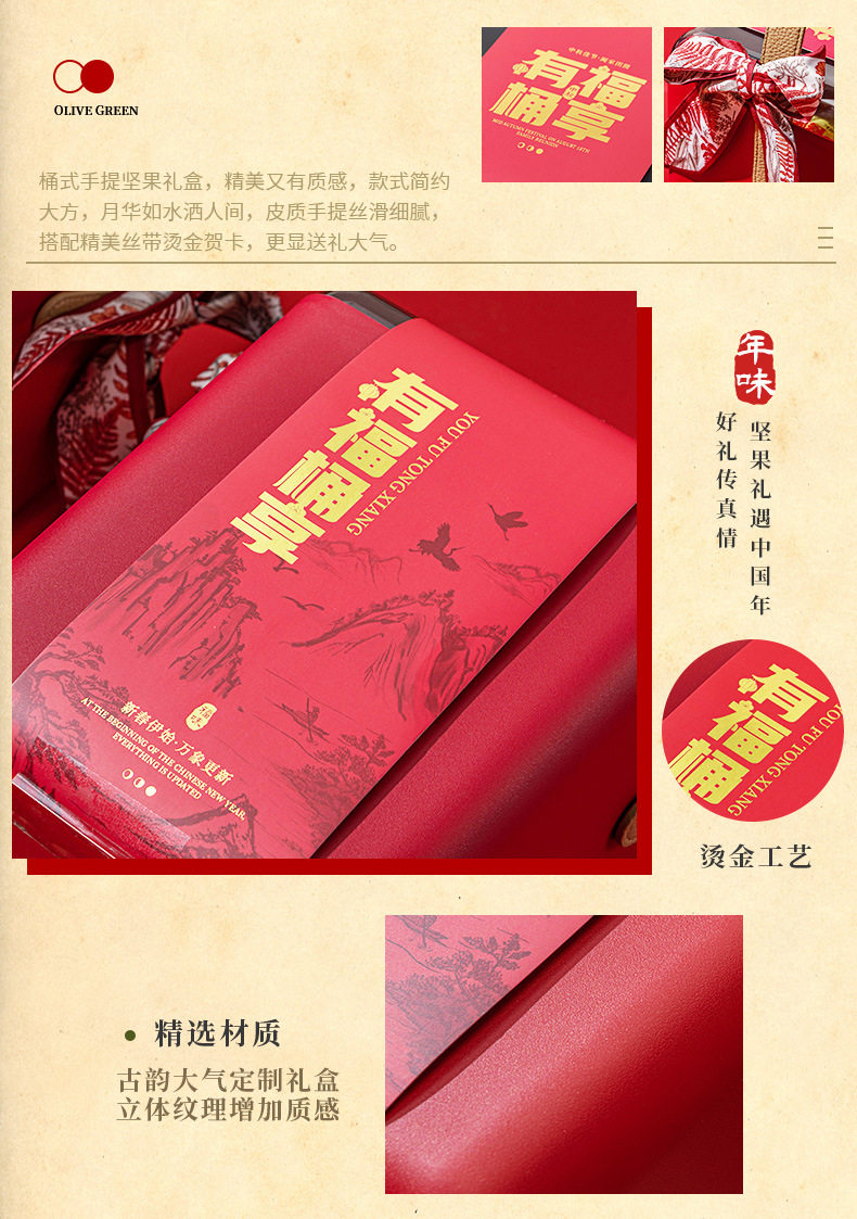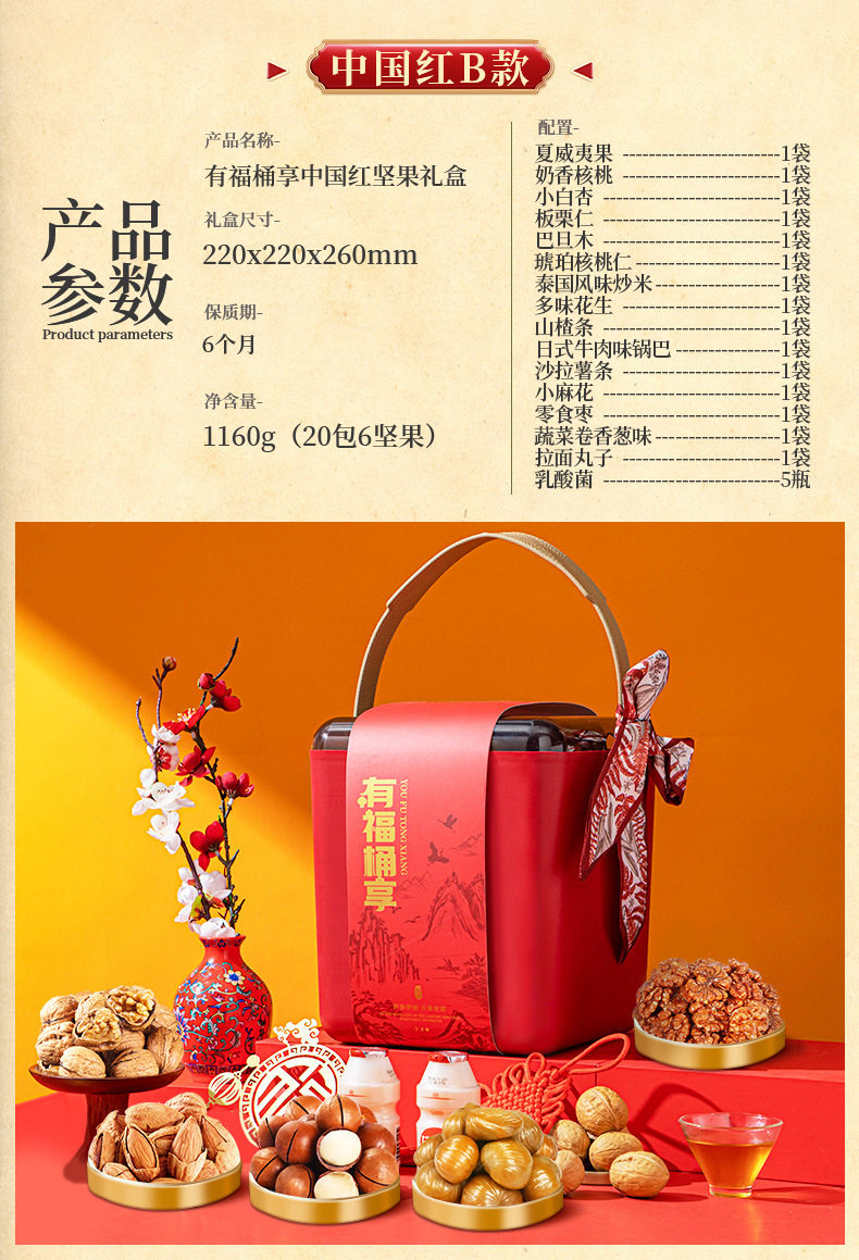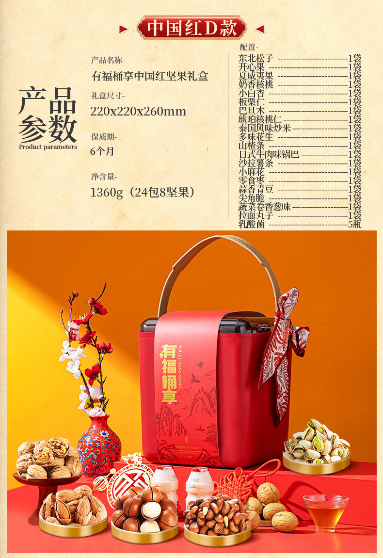 | Packaging specifications | Luxury gift set: 16 packs of assorted nuts,Golden lion happy new year 16 packs of 3 nuts,Chinese new year lion dance style 16-pack 3-nut gift set,Chinese new year lion dance style 18 packs of 4 nuts,Chinese new year lion dance style 20 packs of 5 nuts,Chinese new year lion dance style 22 pack of 6 nuts,Chinese new year lion dance style 24 pack 7 nuts,Chinese new year lion dance style 26 packs 8 nuts,Golden lion happy new year 15 packs of pure nuts,Wealth and fortune arrive: 18 packs of 4 nuts,Golden lion happy new year 20 packs of 5 nuts,Congratulations on getting rich chinese red type a 18 packs of 4 nuts,Congratulations on getting rich chinese red type b 20 packs of 5 nuts,Congratulations on getting rich chinese red c style 22 packs of 6 nuts,Congratulations on getting rich chinese red d style 24 packs of 7 nuts,Congratulations on the chinese new year double layer 11 pack of 4 nuts,Congratulations on the chinese new year! chinese red three-layered gift box with 15 packs of 6 nuts,Parrot green luggage 18-pack with 6 nuts,China red luggage 18-pack with 6 nuts,China red luggage 22 pack 8 nuts,Portable luxury gift box olive green style 13 packs of 7 nuts,Portable luxury gift box elegant orange style 13 packs of 7 nuts,Portable light luxury gift box elegant orange style 13 packs 8 nuts style b,Portable luxury gift box blue and white style 13 packs of 7 nuts,16 packs of 5 nuts for good luck,Moonlight rhyme chinese red 10 packs of 5 nuts,Moonlight rhyme olive green 10-pack with 5 nuts |