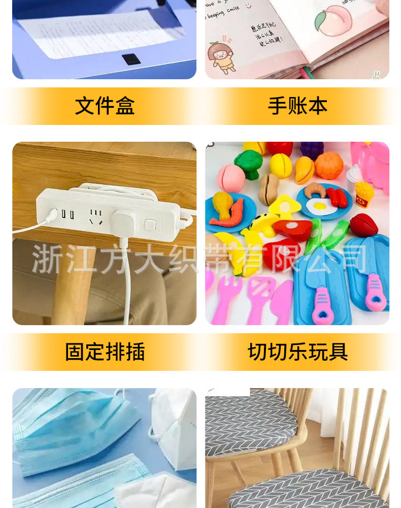 | Scope of application | Protective gear,Packaging,Clothing,Maternal and infant products,Home textile,Toys,Sofa cushion,Medical supplies,Line management tape,Car seat,Children's intelligence development,Driving recorder,Blood pressure monitor armband,Industrial use,Packaging items,Computer wires,Clean wires,Glove accessories,Stroller trolley bicycle electric vehicle,Other |