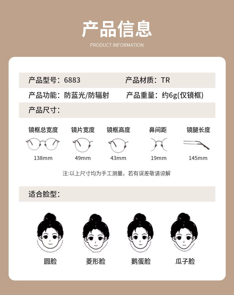 | Frame color | Quality tr-cold brown,Quality tr-frosted tea,Quality tr-beige inside the tea frame,Quality tr-bright black,Quality tr-transparent color,Quality tr-leopard color,Equipped with myopia/brand yishi lu wanxin/high prescription/consult customer service |