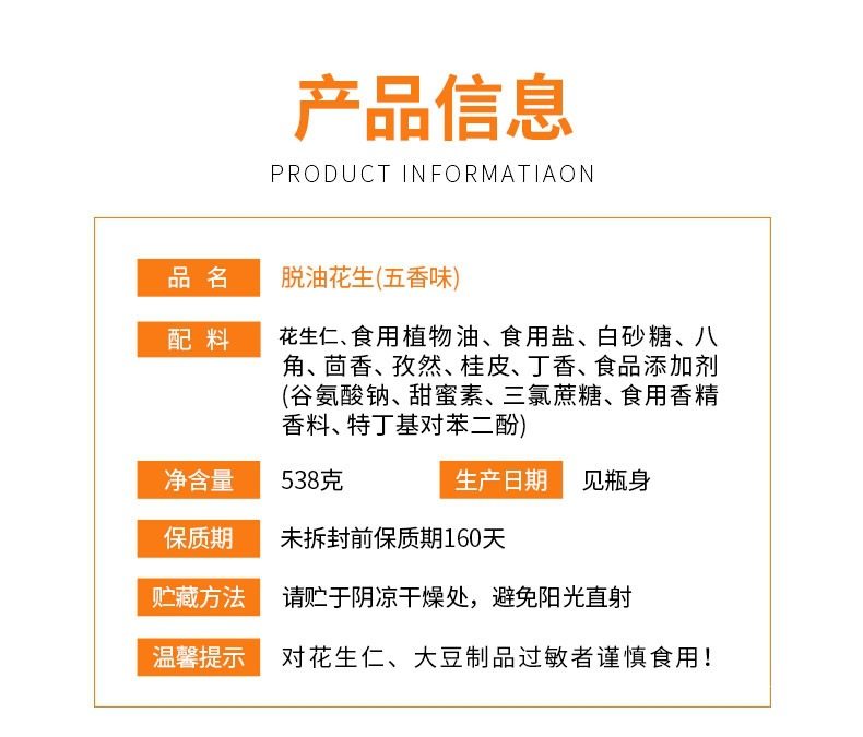 | Packaging specifications | [large jar] deoiled peanuts (five-flavored flavor) 538g*1 can,[large jar] deoiled peanuts (spicy flavor) 538g*1 can,[large jar] decontaminated peanuts (vine pepper flavor) 538g*1 can,[large jar] deoiled peanuts (five-flavored flavor) 538g*2 cans,[large jar] deoiled peanuts (spicy flavor) 538g*2 cans,[large jar] decontaminated peanuts (vine pepper flavor) 538g*2 cans,[large can 538g*2 cans] five-flavor + spicy flavor,[large can 538g*3 cans] five-flavor + spicy flavor + vine pepper flavor,[large can 538g*4 cans] five-flavor 4,[large can 538g*4 cans] spicy flavor 4,[large can 538g*4 cans] spiced flavor 2 + spicy flavor 2,[small can] deoiled peanuts (five-flavored flavor) 238g*1 can,[small can] deoiled peanuts (spicy flavor) 238g*1 can,[small can] deoiled peanuts (vine pepper flavor) 238g*1 can,[small can] deoiled peanuts (five-flavored flavor) 238g*2 cans,[small can] deoiled peanuts (spicy flavor) 238g*2 cans,[small can] deoiled peanuts (vine pepper flavor) 238g*2 cans,[small can 238g*3 cans] five flavor + spicy flavor + vine pepper flavor,Fish skin peanuts 538g*2 cans,[2 cans] spiced degreased peanuts 538g + fish skin peanuts 538g,[2 cans] five-spice decontaminated peanuts 538g + three-flavor fish skin peanuts 450g,[2 cans] spiced decontaminated peanuts 538g + salt flavored black beans 436g,[2 cans] spiced decontaminated peanuts 538g + vine pepper flavored fish skin peanuts 450g,[4 cans] spiced decontaminated peanuts 538g + fish skin peanuts 538g + three flavors fish skin peanuts 450g + vine pepper fish skin peanuts 450g |
