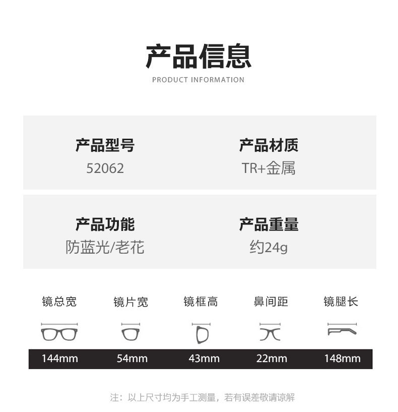 | Lenses | Paste zoom label [degree +200],Presbyopia 100 degrees [recommended for those under 49 years old],Presbyopia 150 degrees [recommended for 50-54],Presbyopia 200 degrees [recommended for ages 55-59],Presbyopia 250 degrees [recommended for 60-64 years old],Presbyopia 300 degrees [recommended for ages 65-69],Presbyopia 350 degrees [recommended for 70-74 years old],Presbyopia 400 degrees [recommended for those over 75 years old],0 degree anti-blue light |