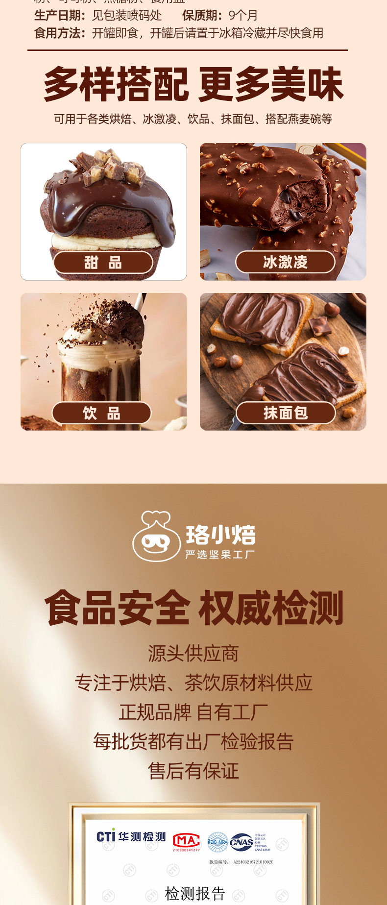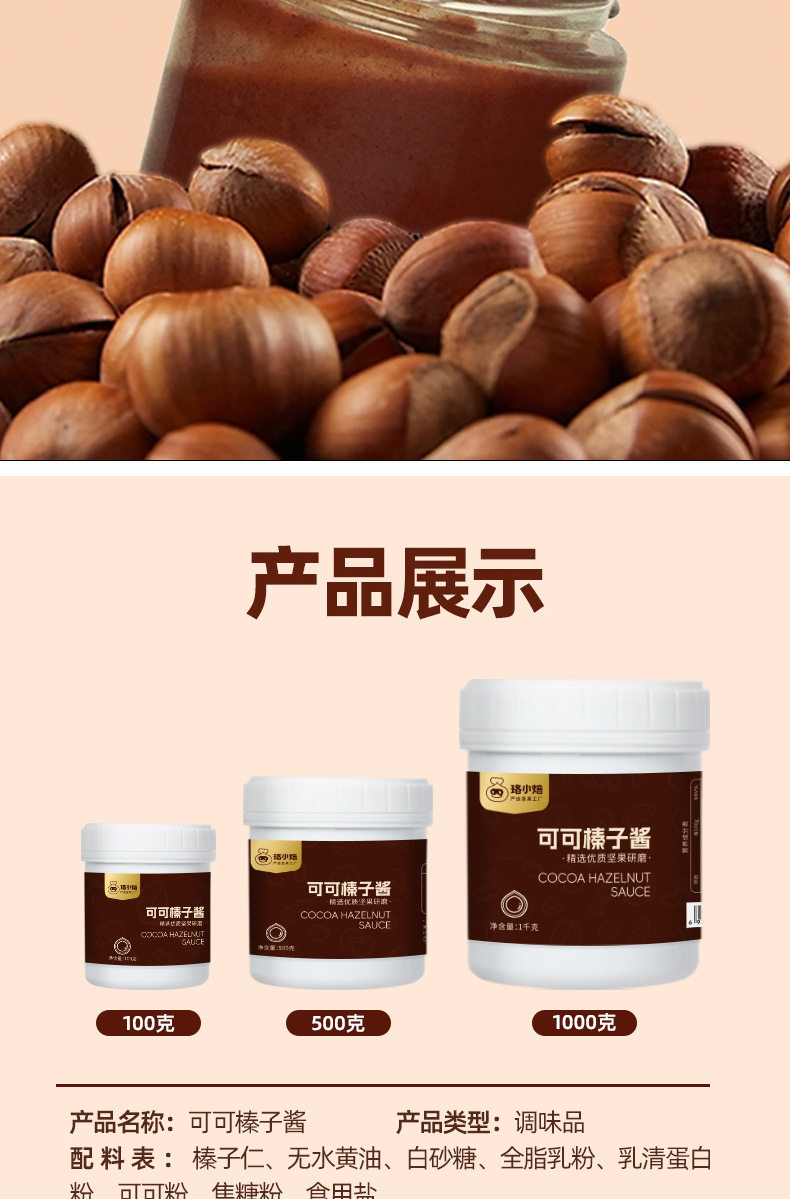 | Packaging specifications | Cocoa hazelnut spread 100g,Cocoa hazelnut spread 500g,Cocoa hazelnut spread 1000g |