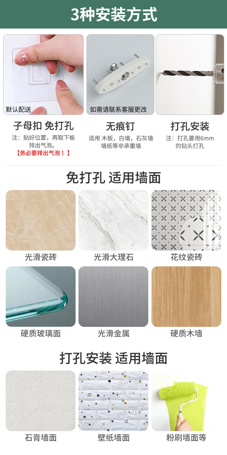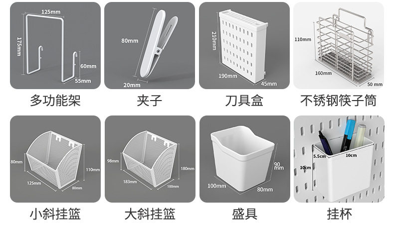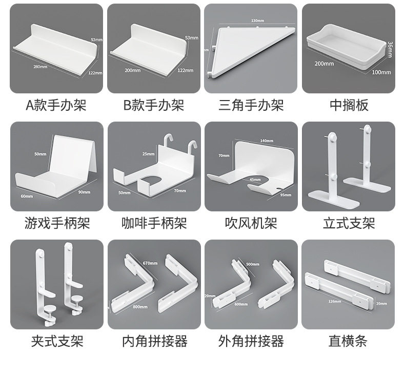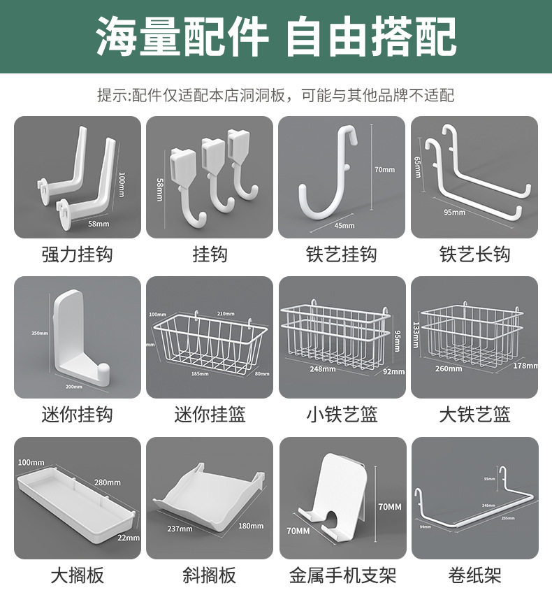 | Color | White square plate package 1 (1 square plate + 7 accessories),White square plate package 2 (2 square plates + 10 accessories),White square plate package 3 (3 square plates + 17 accessories),White square plate package 4 (4 square plates + 18 accessories),White square plate package 6 (6 square plates + 21 accessories),White longboard package 1 (1 longboard + 7 accessories),White longboard package 2 (2 longboards + 9 accessories),White longboard package 3 (3 longboards + 17 accessories),White longboard package 4 (4 longboards + 23 accessories),White longboard package 6 (6 longboards + 25 accessories),Container white,Middle shelf white,Long shelf white,Covered storage box,20cm paper holder white,28cm kitchen paper towel holder white,White pot lid holder,Paper roll holder white,Octopus six-claw hook [rotatable],[with baffle] knife holder box white,304 stainless steel chopstick barrel,Black longboard 42x30,White longboard 42x30,White square plate 30x30,Small square board 19.5*22cm white,Large horizontal board 42.5*33 white,C size extra large horizontal panel-white,Extra large hole board [white],5 strong plastic hooks white,Mini hooks 5 white,Multifunctional rack white,3 metal hooks white,2 large hooks white,2 iron short hooks white,2 iron long hooks white,[new style] round small hooks, white 5 pcs,Wrought iron mini clips, white,2 wrought iron clips white,[new style] small pack of paper tissues hanging basket white,Iron paper towel hanging basket white,Small wrought iron basket white,Large iron basket white,Small inclined hanging basket white,Large slanted hanging basket white,Mini hanging basket white,Three-layer iron hanging basket white,Transparent hanging cup,White hanging cup,Long tube storage box,Water ripple soap dish [with water tray],White razor holder,Astronaut toothbrush holder white,Toothbrush storage box,Coffee handle holder white,[new style] abs coffee handle holder white,Large coffee handle holder white,Coffee filter holder white,Hair dryer holder white,White triangle figure stand,20cm figure stand white,28cm figure stand white,Abs game console handle bracket white,Mouse stand white,Keyboard stand white,Mobile phone holder [white],Curved headphone hook white,Large rotating mobile phone holder [can hold ipad),White b-type adapter + gooseneck stand,[new style] horizontal style - 15 white thread clamps,[new style] vertical style - 15 white thread clamps,White seamless nails 4 pack,[new style] figure box 9*9cm white,[new style] figure box 9*9cm transparent,[new style] figure box 9*28cm white,[new style] figure box 9*28cm transparent,[new style] figure box 16*28cm white,[new style] figure box 16*28cm transparent |