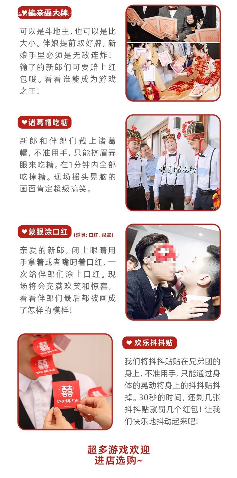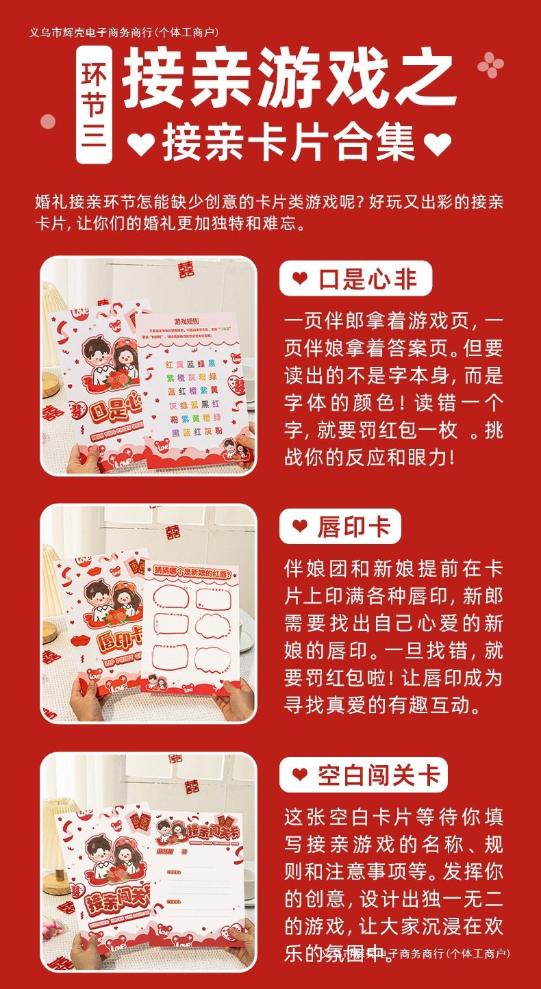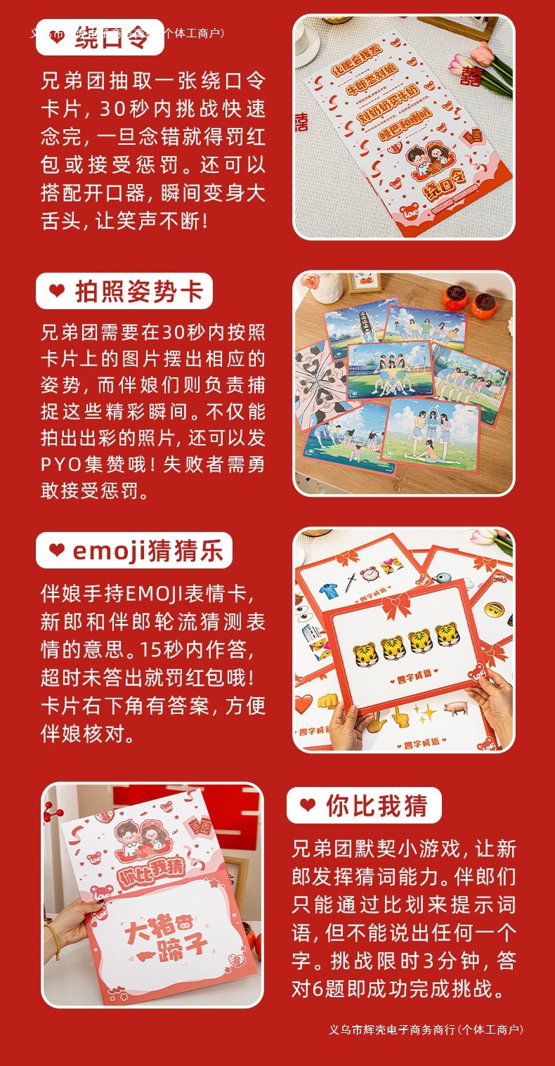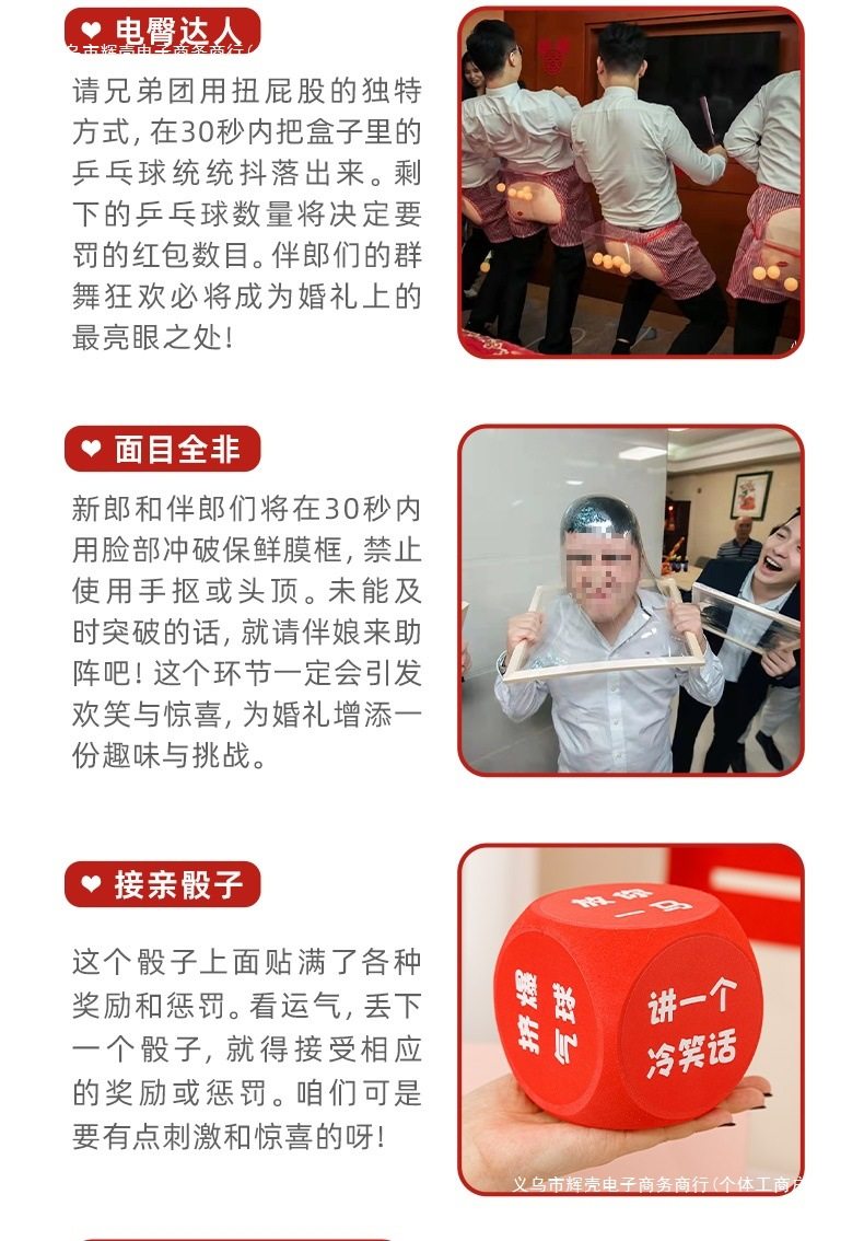 | Color | Refers to the west-small finger stick,Electric hip expert-10 ball style,Classic antler ferrule-4 rings,Red antler ferrule-4 color circles,Take care of your big soles (send a pack of happy words),Play,Flower gun + 100 banknotes + 5 wedding chopsticks (highly recommended for new products),(everyone is buying) my family has a wedding gun + 100 banknotes + 5 happy chopsticks,100 pieces of my family’s wedding money refill,Red wedding oath book,Unobedient floral pants,My family has a festive gun + 100 banknotes,Zhuge hat eats candy,Milky white, 1 speaker (battery included),Throwing pot-10 arrows,Dinosaur ball gun-cartoon version,Challenge 520 hand-thrown ball set (gun not included),Frog transfer straw,Happy shake stickers 1 pack,The face is completely not framed,1 white wedding movie pattern (good atmosphere),Color table tennis bubble ball double racket set,Dark blue, 3 squats with kissing radish,Sky blue, 6 squats with kissing radish,Touch mahjong with eyesight - my wife and i love you,Take care of happiness - happy today,Transparent land step + happy eye mask,Internet celebrity beating me duck,Two sets of orange scissors stone cloth,Five violet bridesmaid fans,Lion awakening hand biting toy,Royal blue golf set,Frog balance tree,Dark khaki cloth color (new model recommended) 1 white goose set + ring set,Blue (new model recommended) yellow set of my duck 1 + ring set,1 set of 20 beads (1 plate + 2 cups + 2 chopsticks),Khaki pick up the word chess of kissing,Purple take a kiss and roll fun-happy day,Dark green punishment mace 1,Dark brown groom fan with two handles,Maroon wheat straw fan 2 grips set,Light purple rich money gun 100 banknotes,6 light brown triangular hats for wedding shoes,Purple red kiss bowling ball,Brown small red wedding hammer 3 pieces,Table tennis backgammon-2 chessboard + 30 balls,1 bubble machine,Coke stickers-6 sets of rings,Wen zhi married door locking stickers 6 pieces,Sisters don’t clog the door sticker 6 pieces,Happy diy scratch card,Red model, quick ask and answer,Red lip print card,The red mouth is heart not,Red emojie guessing idioms 10 pictures,10 red photo posture cards,6 pictures of red mouth blows,6 red breakthrough cards,Red sentence challenge (11 pictures, including answers),The secret that red cannot be said (10 photos),Red you guess package a10 sheets than me,Red you guess package b10 photos than me,Take the test paper,10 photos of kiss scraping music,Expander wrap mouth order,Love candle + mouth expander,1 mouth expander,Cartoon pvc warranty certificate (26*38cm),Take 1 person's vision chart,I’m married with my eyesight chart + finger stick,To watch the west - large finger stick,1 camel ponytail glasses,Watch the west-plush gloves,Magnetic suction model connects to huarong road,1 10cm connected to kiss dice,Electric hip expert-15 happy ball model,Dark purple large pirate bucket,A chocolate-colored groom fan,1 brown cat eye glasses,Emerald green hairband 1,1 green hardened finger pressure plate,Cyan wedding puzzle,Light green finger pressure plate stepping on balloon,Military green acupressure plate skipping rope,Bright yellow 1 large screaming chicken,Champagne love puzzle,Lemon yellow playing chess,Fluorescent yellow, hurry up with 20 pictures,Ginger rabbit headband swan skirt,Yellow bell shoe box,Light yellow ferrule 6 pieces,Orange red door blocked red envelope 36 pieces,Lotus color 1 large paper dragon,Watermelon red koi goldfish lamp 1,Rose red lion awakening lantern 1,1 burgundy 20cm happy word lantern,8 red fireworks guns,Pink 4 push music,1 gray dice scent,Light gray retro wedding,Black cartoon wedding,Silver masked lips |