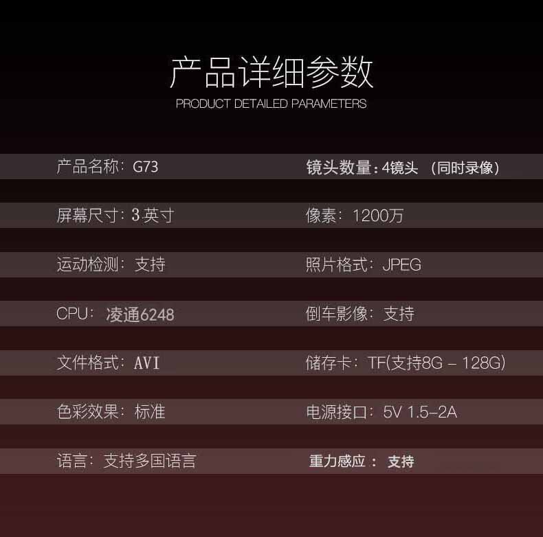 | Function | Reversing image,Mobile detection,Parking monitoring,Night vision fill light,Night vision enhancement,Front and rear recording |