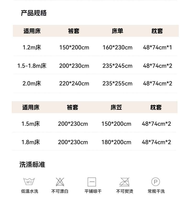| Size specifications | 1.2m three-piece bed set [sheets 160x230 quilt cover 150x200],1.5m four-piece bed set [sheets 235x245 quilt cover 200x230],1.8m four-piece bed set [sheets 235x245 quilt cover 200x230],2.0m four-piece bed set [sheets 235x255 quilt cover 220x240],1.5m four-piece bed set [fitted sheet 150x200 quilt cover 200x230],1.8m four-piece bed set [fitted sheet 180x200 quilt cover 200x230],Single quilt cover 150x200cm [suitable for 150x200cm quilt],Single quilt cover 200x230cm [applicable to 200x230cm quilt],Single quilt cover 220x240cm [applicable to 220x240cm quilt] |