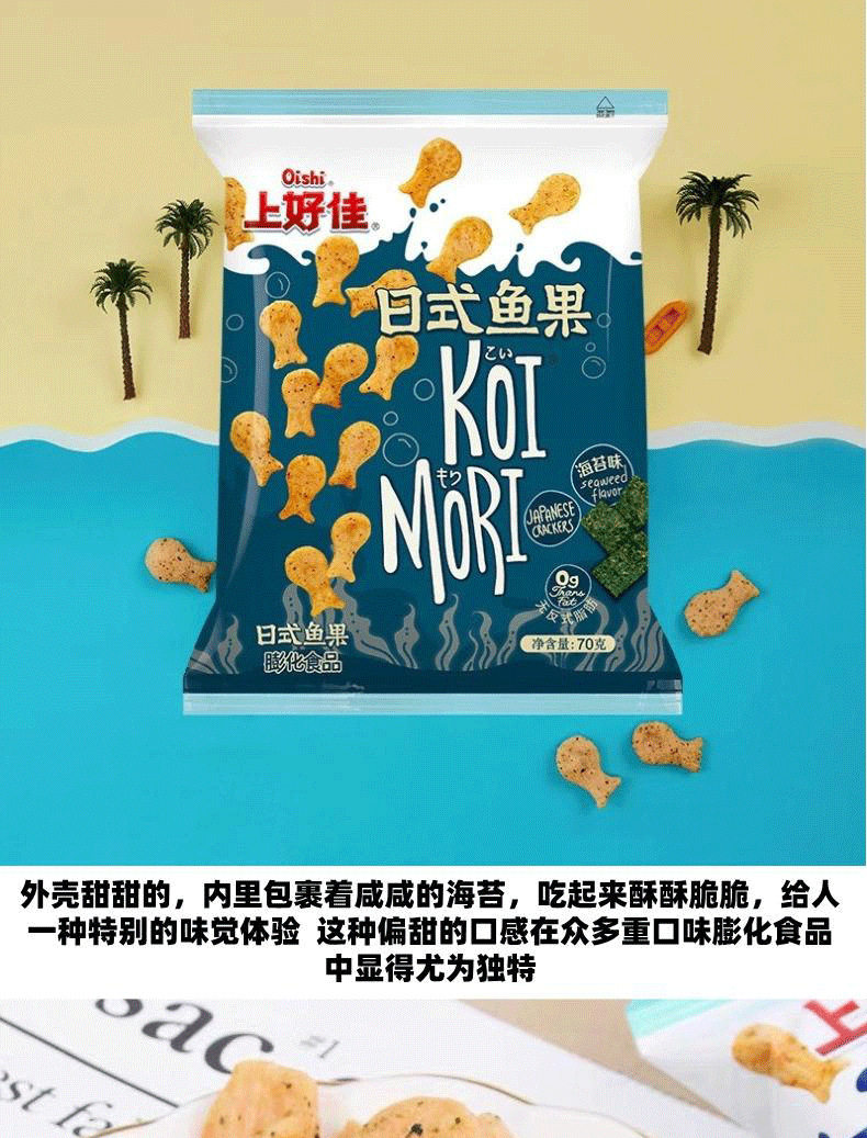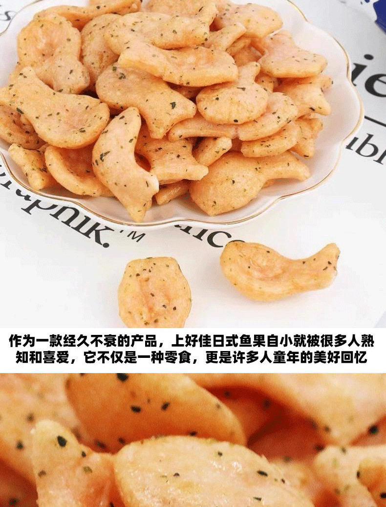 | Packaging specifications | Shanghaojia [japanese fish, fruit and seaweed flavor] 42g single bag (20 bags per box),Shanghaojia [japanese fish, fruit and seaweed flavor 70g] single bag (12 bags per box),Shanghaojia [onion rings] 30g single bag (20 bags per box),Shanghaojia [onion rings 65g] single bag (12 bags per box),Shanghaojia [fresh shrimp crackers] 32g single bag (20 bags per box),Shanghaojia [fresh shrimp crackers 65g] single bag (12 bags per box),Shanghaojia [fresh shrimp chips] 30g single bag (20 bags per box),Shanghaojia [fresh shrimp chips 60g] single bag (12 bags per box),Shanghaojia [corn sticks] strawberry flavor 32g single bag (20 bags per box),Shanghaojia pastoral potato chips [tai er pickled fish flavor 70g] single bag (12 bags per box),Shanghaojia pastoral potato chips [tomato flavor] 40g single bag (20 bags per box),Shanghaojia pastoral potato chips [tomato flavor 70g] single bag (12 bags per box),Shanghaojia pastoral potato chips [bbq flavor] 40g single bag (20 bags per box),Shanghaojia pastoral potato chips [bbq flavor 70g] single bag (12 bags per box) |