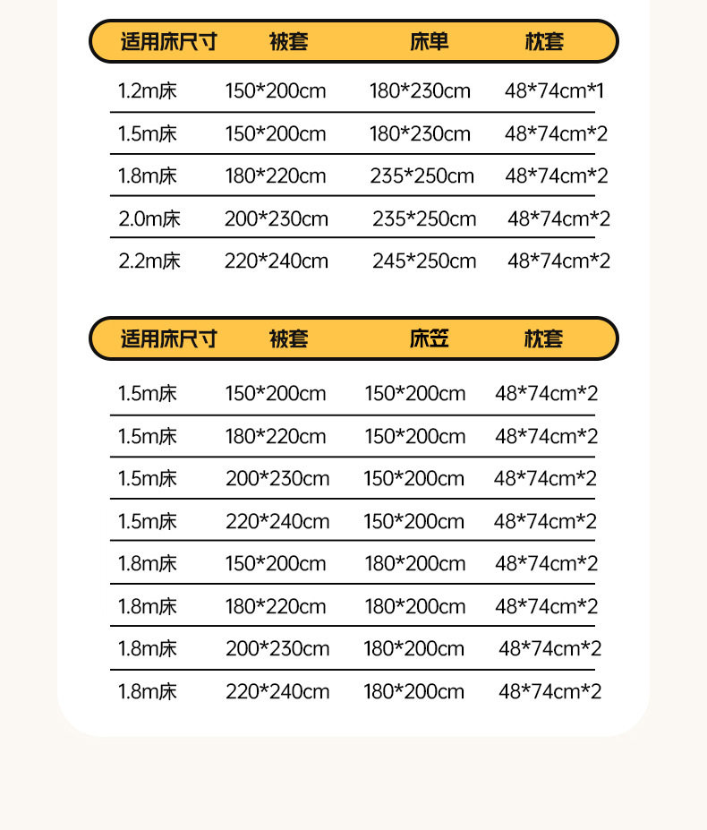 | Size specifications | 1.2m bed sheet three-piece set [quilt cover 150*200],1.5m bed sheet four-piece set [quilt cover 150*200],1.8m bed sheet four-piece set [quilt cover 180*220],2.0m bed sheet four-piece set [quilt cover 200*230],2.2m bed sheet four-piece set [quilt cover 220*240],1.5m fitted sheet set of four [quilt cover 180*220],1.8m fitted sheet set of four [quilt cover 200*230] |