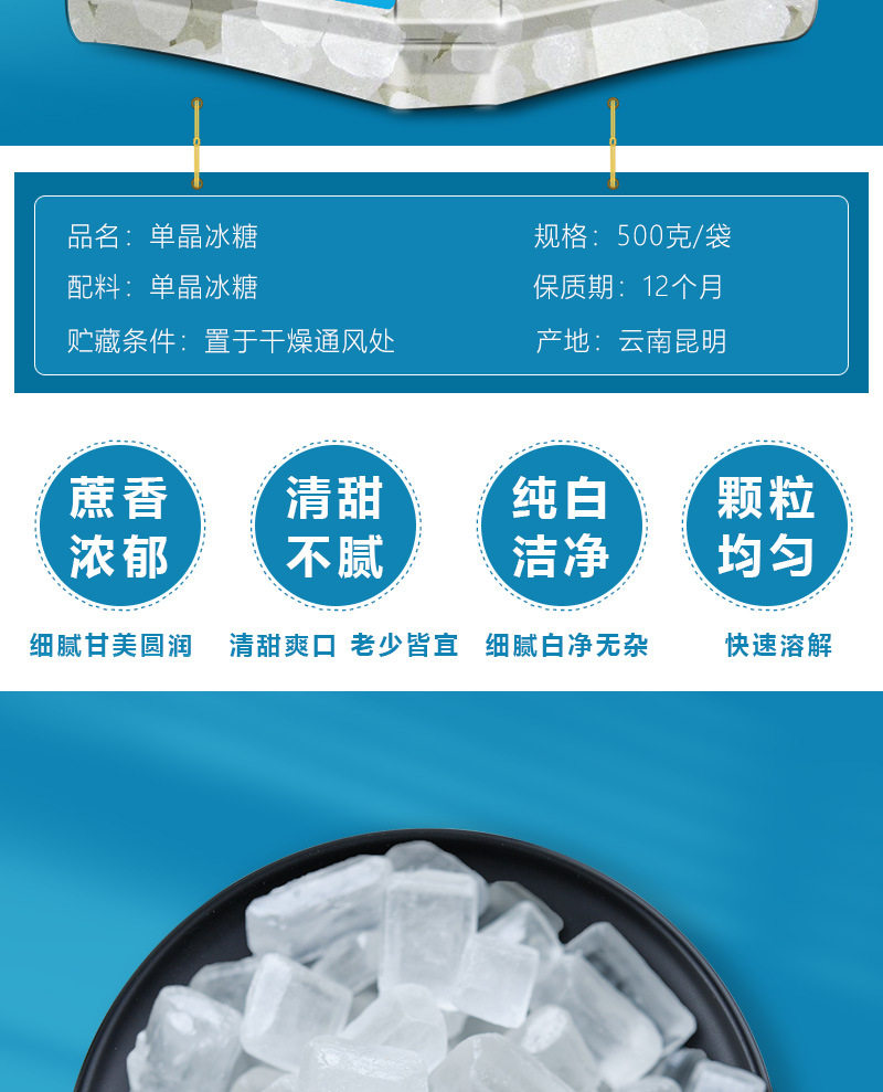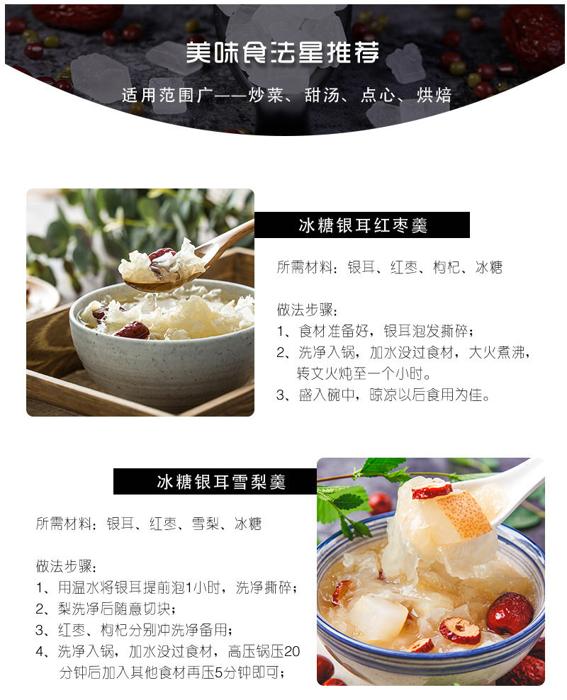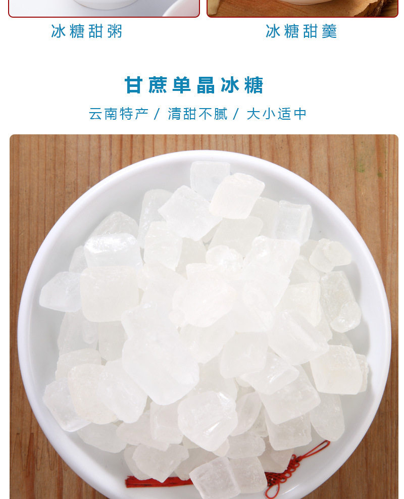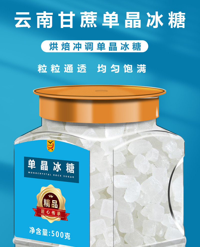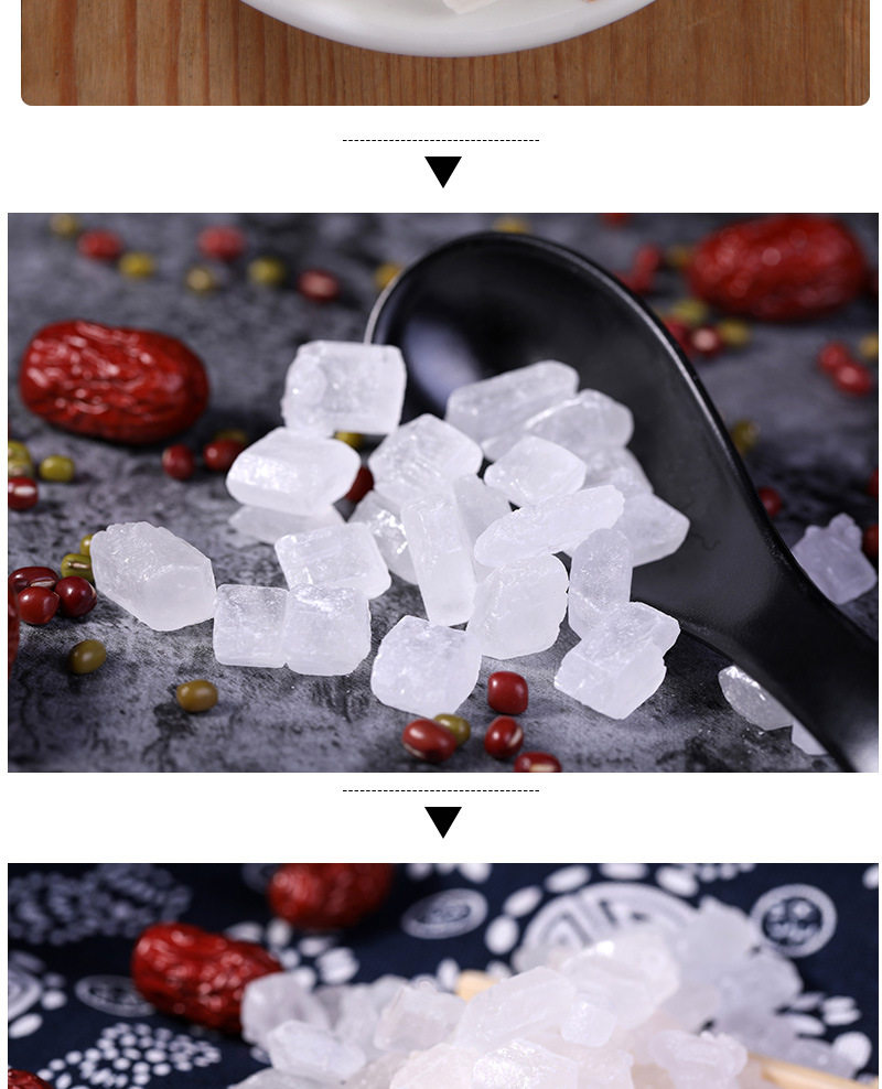 | Packaging specifications | Single crystal rock sugar 500g x1 can,Single crystal rock sugar 500g x 2 cans,Single crystal rock sugar 500g x 3 cans,Single crystal rock sugar 500g x5 cans |
