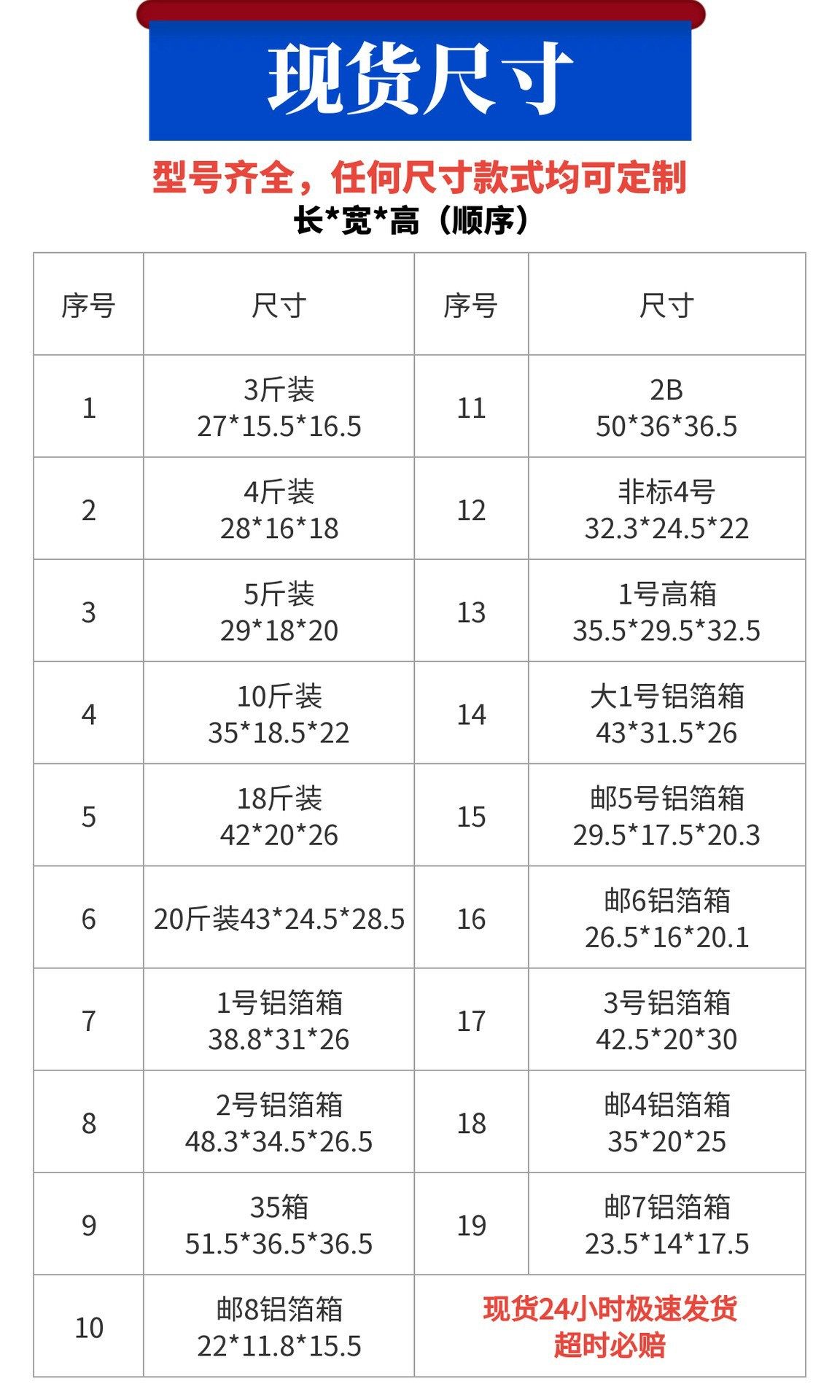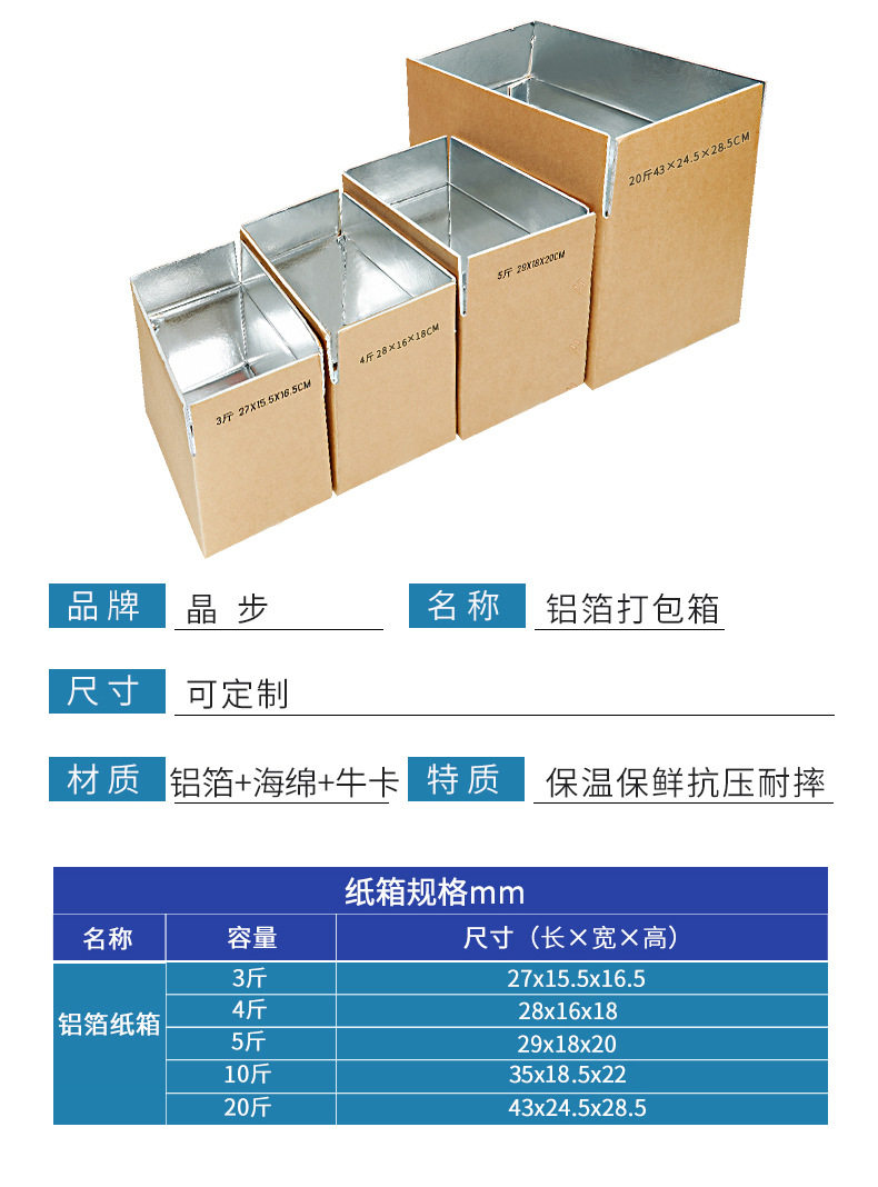 | Specifications and models | 0.5-1.0kg pack 19.5*10.5*13.5 (no. 9),1.0kg aluminum foil box 22.3*11.8*15.5 (mail 8),1.5kg aluminum foil box 24*14*17.5 (post 7),1.5kg packed in aluminum foil box 27*15.5*16.5,2kg aluminum foil box 27.5*16*20.3 (postage 6),2kg packed in aluminum foil box 28*16*18,2.5kg aluminum foil box 30.5*17.5*20.5 (post 5),5kg pack aluminum foil box 35.5*20*25,5kg aluminum foil box 33.8*24.5*22.3 (non-standard 4,7.5kg aluminum foil box 44*20.5*30.8 (no. 3),9kg pack aluminum foil box 36*29.5*32.5,9kg aluminum foil box 39*31.5*26.5 (no. 1),10kg aluminum foil box 43.5*31.9*25 (large size 1),10kg packed in aluminum foil box 43*24.5*28.5,10kg pack aluminum foil box 42*28*32,12.5kg aluminum foil box 49*34.5*26.5 (no. 2),15kg aluminum foil box 51*35.8*30.8 (2b),17.5kg pack aluminum foil box 61*28*26,20kg packed in aluminum foil box 52*36.2*36.5 (35 boxes),35kg aluminum foil box 55.5*55.5*38.5 (55 boxes,No. 1 aluminum foil box 39*31.5*26.5,Large 1 size aluminum foil box 43.5*31.9*25,No. 2 aluminum foil box 49*34.5*26.5,No. 3 aluminum foil box 44*20.5*30.8,Postal no. 4 aluminum foil box 35.5*20*25,Non-standard no. 4 aluminum foil box 33.8*24.5*22.3,Postal no. 5 aluminum foil box 30.5*17.5*20.5,Postal no. 6 aluminum foil box 27.5*16*20.3,Postal no. 7 aluminum foil box 24*14*17.5,Postal no. 8 aluminum foil box 22.3*11.8*15.5,No. 9 19.5*10.5*13.5,2b aluminum foil box 51*35.8*30.8,35 boxes of aluminum foil boxes 52*36.2*36.5,55 boxes of aluminum foil boxes 55.5x55.5x38.5,No. 1 high box aluminum foil box 36*29.5*32.5 |