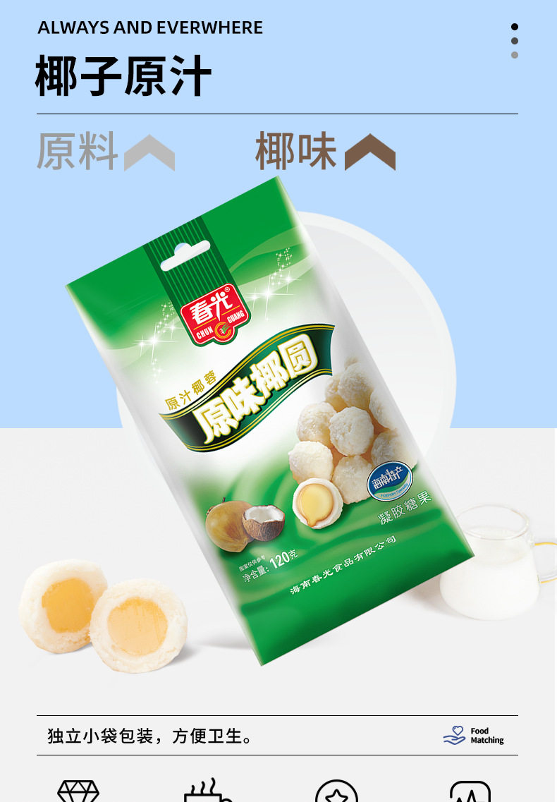 | Packaging specifications | 120g*32 spring light original coconut round,120g*32 spring durian coconut round,135g*15 spring light original coconut round,135g*15 spring durian coconut round,200g*24 spring light original coconut round,200g*24 spring durian coconut round,450g*10 spring light original coconut round,450g*10 spring durian coconut round |