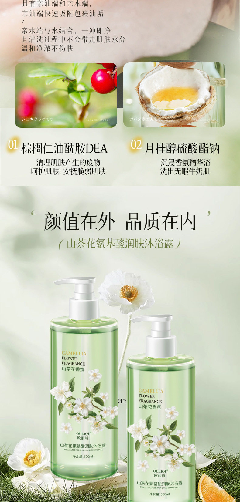 | Net content | Camellia shower gel 500ml (green),Camellia shampoo 500ml (green),Camellia shower gel 500ml (green) + camellia shampoo 500ml (green) |