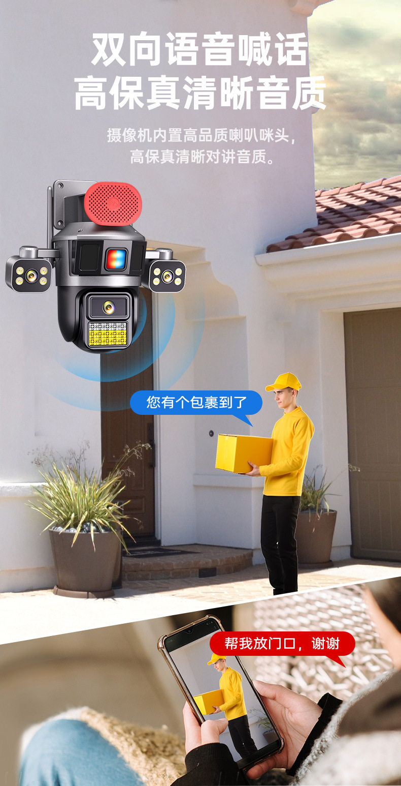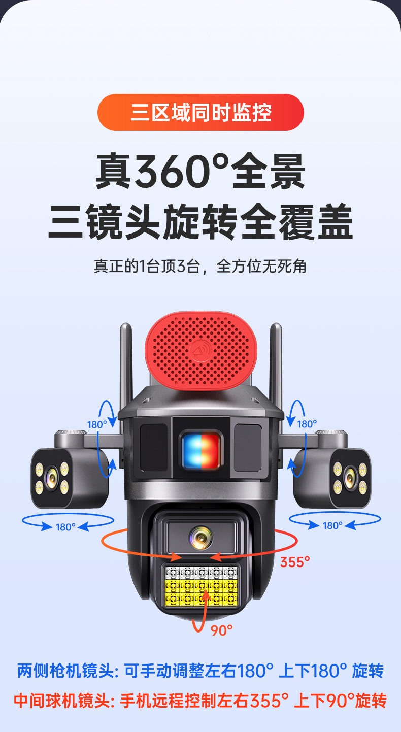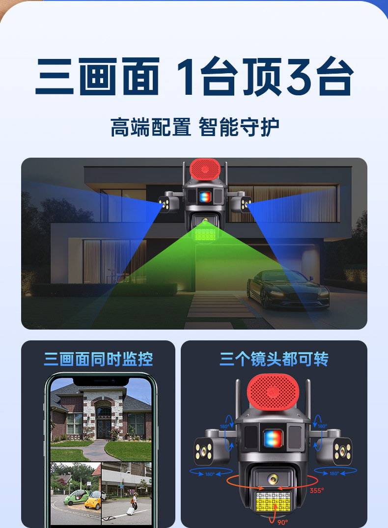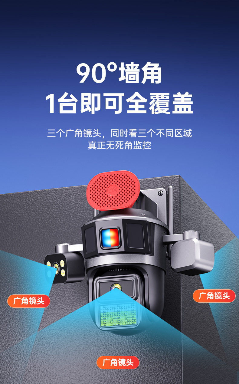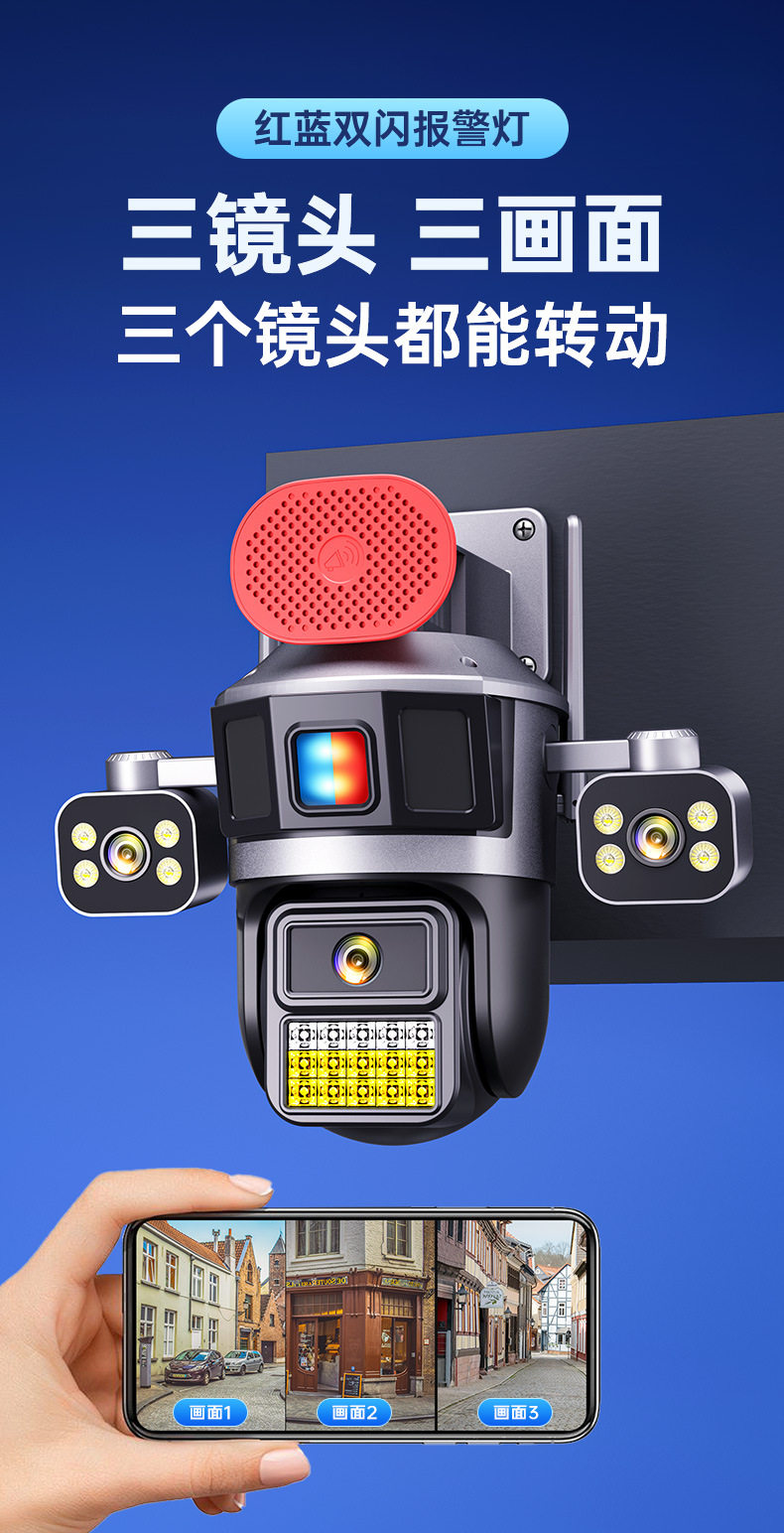 Surveillance Camera True Three Screen Three Lens Panoramic Home Outdoor HD Monitor Day and Night Full Color Waterproof New