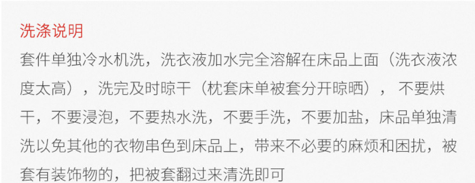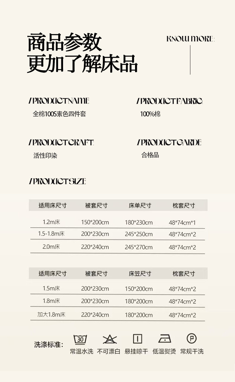 | Dimensions | 1.2m bed sheet three-piece set (for 150*200 quilt core),1.5m/1.8m sheet four-piece set (for 200*230 quilt core),1.5m bed hat four-piece set height within 28 (applicable to 200*230 quilt core),1.8m bed hat four-piece set height within 28 (applicable to 200*230 quilt core),2.0m bed sheet four-piece set (for 220*240 quilt core),1.8m increase quilt cover bed hat four-piece set height within 28 (applicable to 220*240 quilt core) |