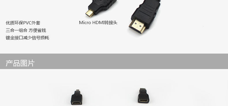 | Color | Three-in-one complete set blister packaging,Three-in-one complete pe bag,Hdmi cable [ 1.5m ],Micro hdmi adapter,Mini hdmi adapter |