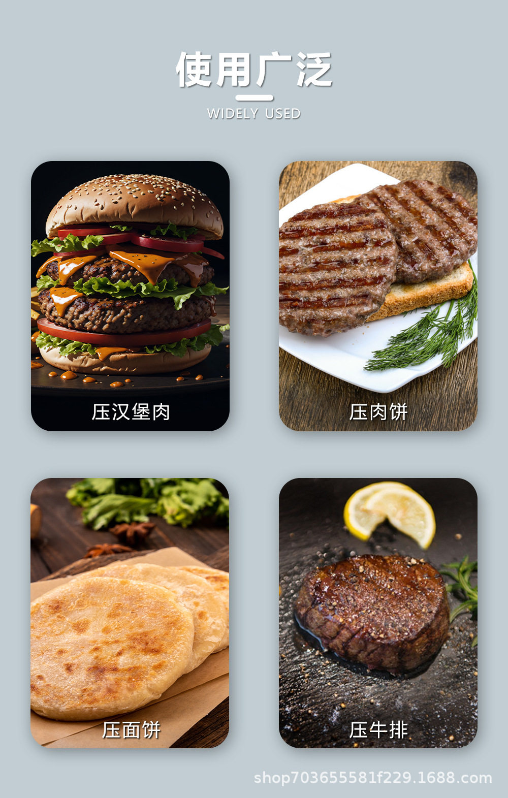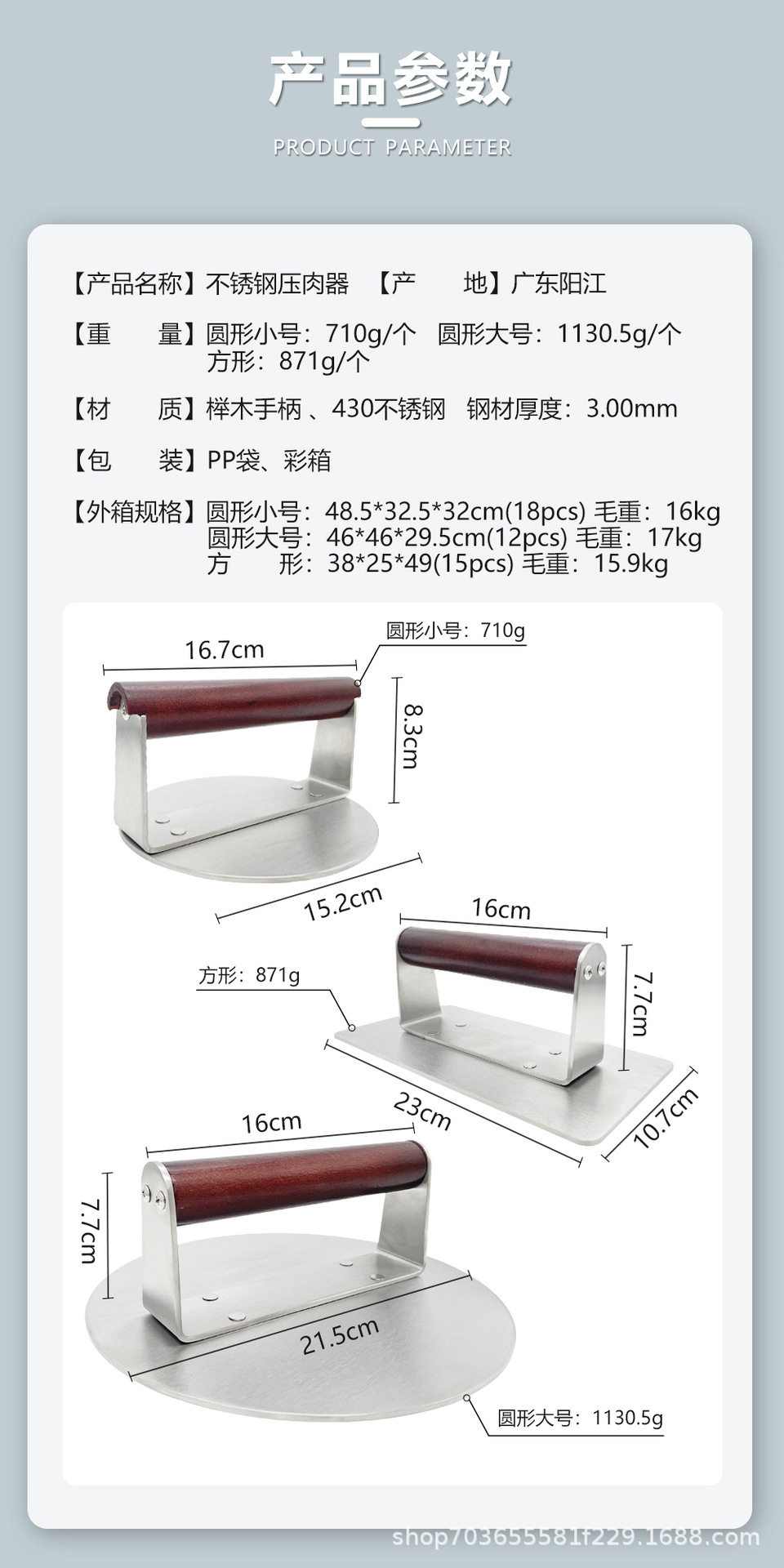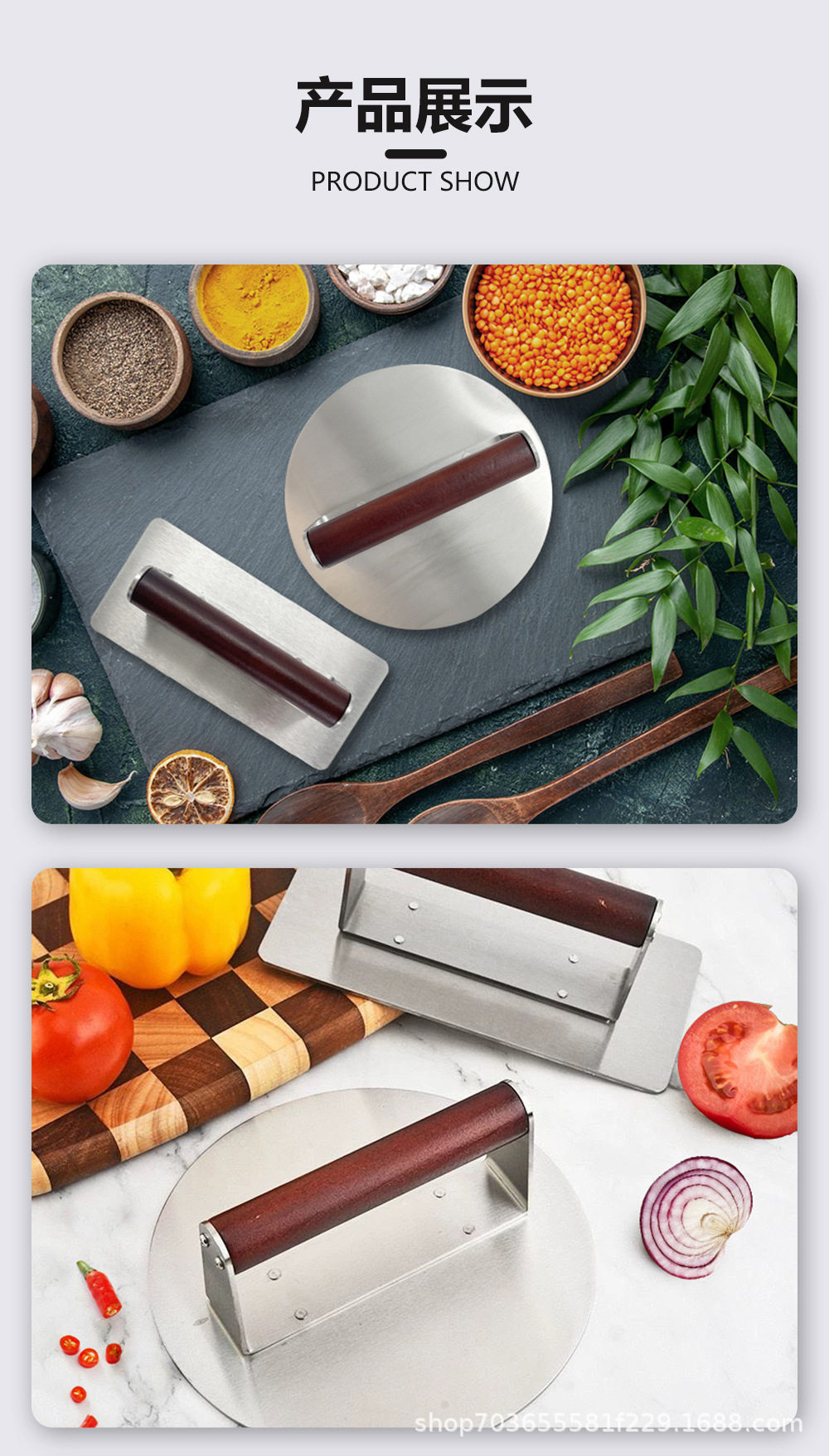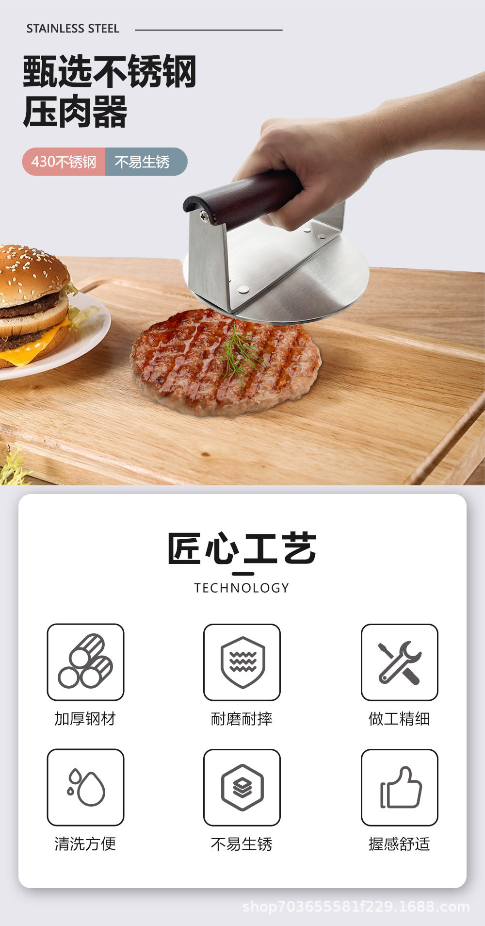 | Specifications | Large burger press (boxed),Small burger press (boxed),Square burger press (boxed),Large burger press (pp bag),Small burger press (pp bag),Square burger press (pp bag) |
