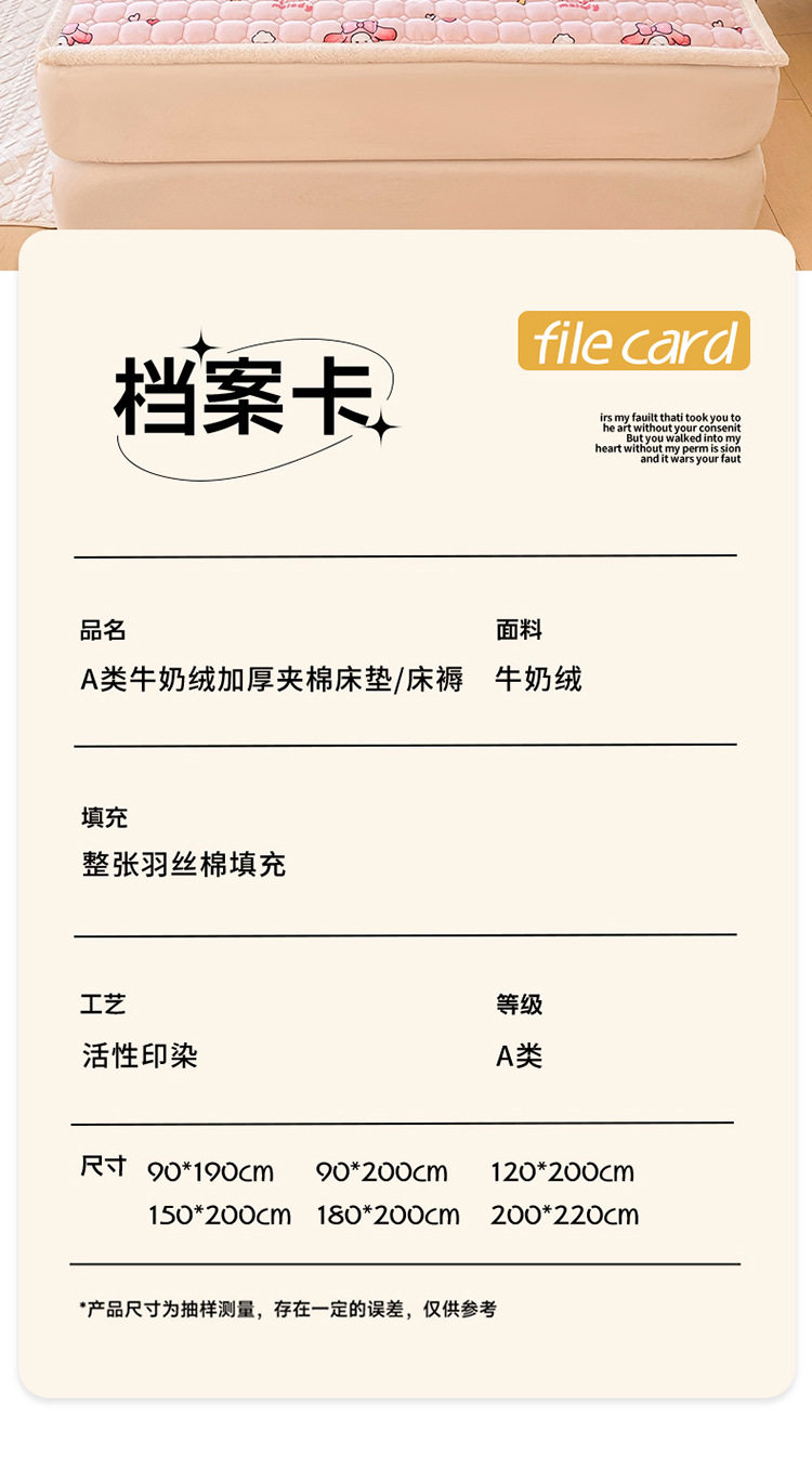 | Size specifications | One quilted pillowcase,A pair of quilted pillowcases,90*200 quilted mattress,120*200 quilted mattress,150*200 quilted mattress,180*200 quilted mattress,200*220 quilted mattress,90*200 quilted mattress + one pillowcase,120*200 quilted mattress + one pillowcase,150*200 quilted mattress + 2 pillowcases,180*200 quilted mattress + 2 pillowcases,200*220 quilted mattress + 2 pillowcases |